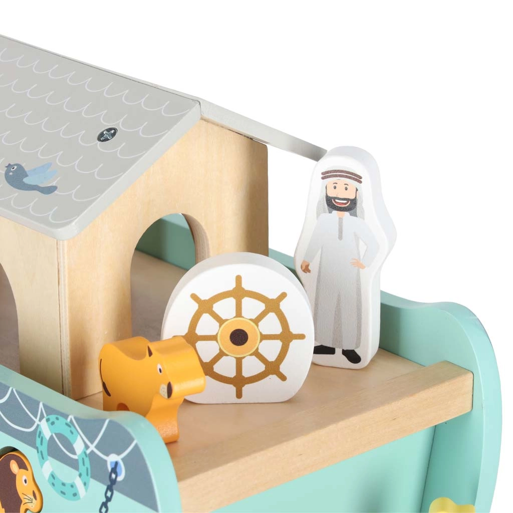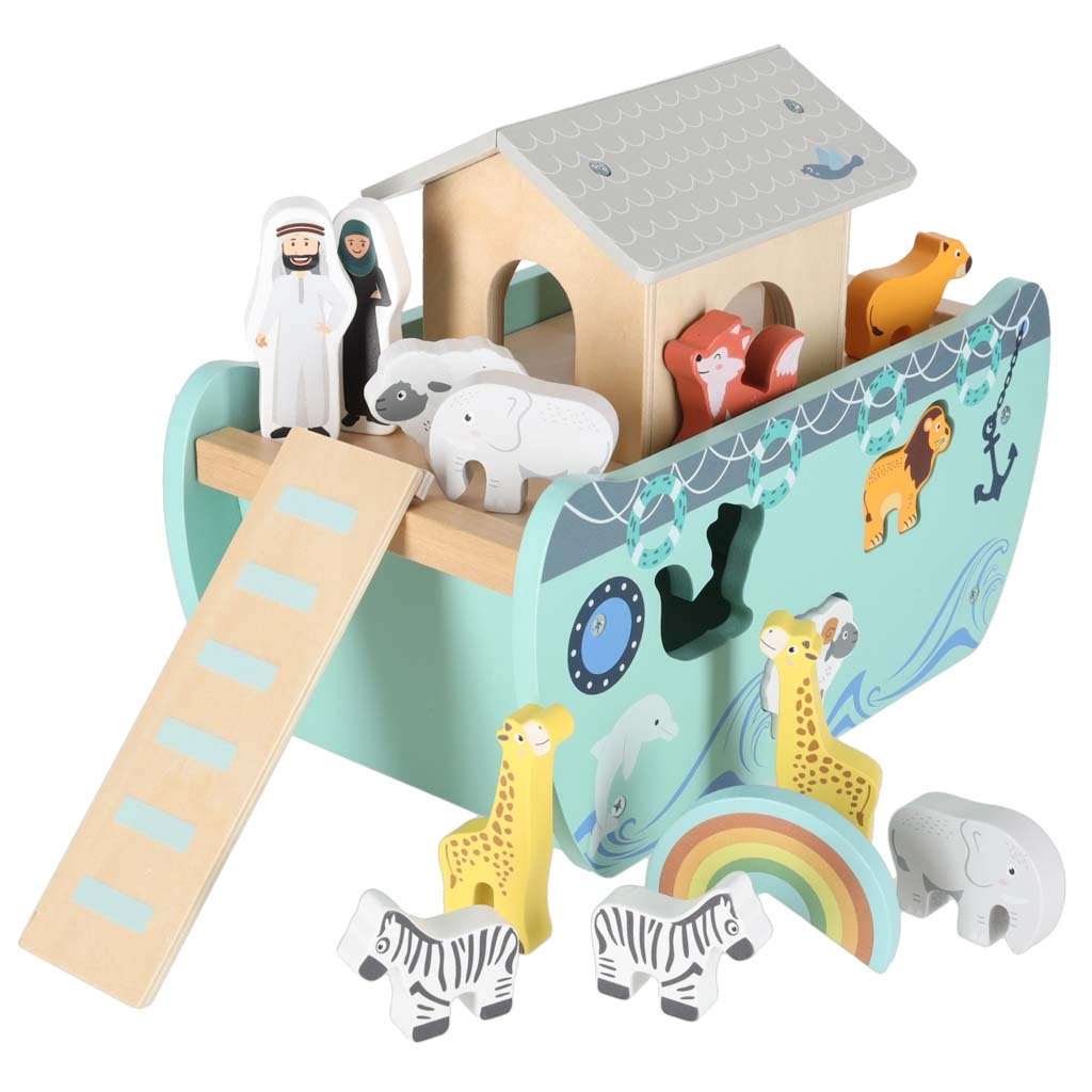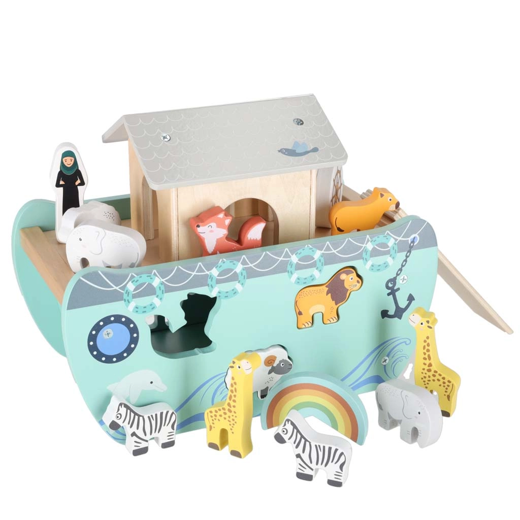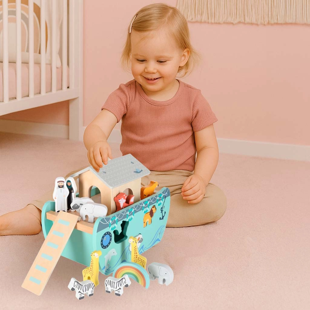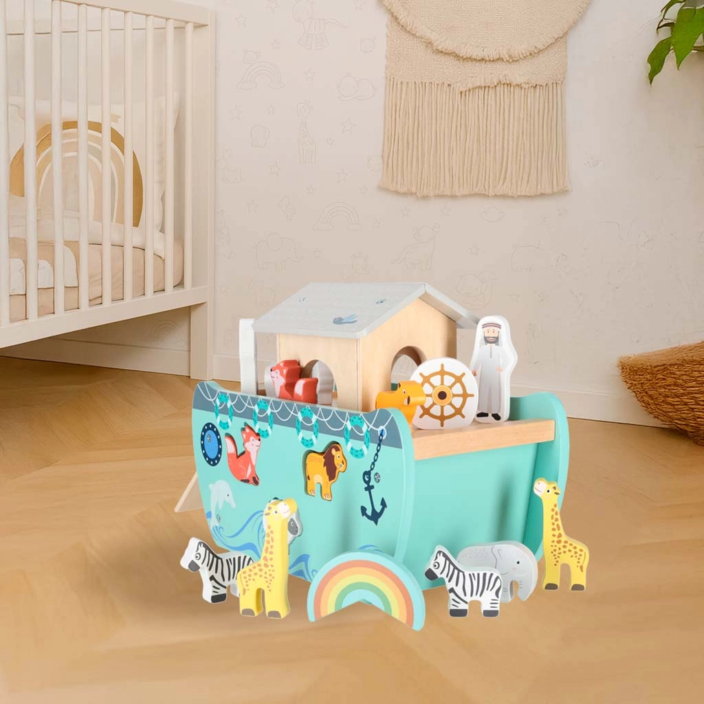 Scoprite un giocattolo in legno che unisce smistatore di forme, gioco libero e narrazione. L’arca con rampa e tetto removibili nasconde un set di figurine di animali e due personaggi, Noè e la moglie: i bambini possono caricare la barca, governarla con il timone e inserire gli animali nelle aperture corrette.
