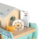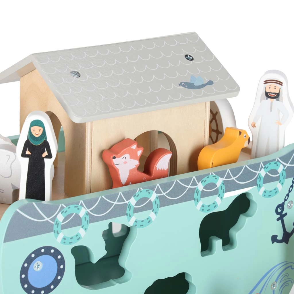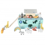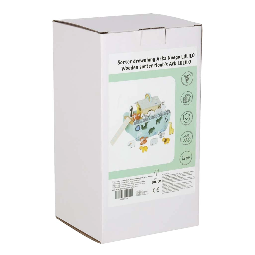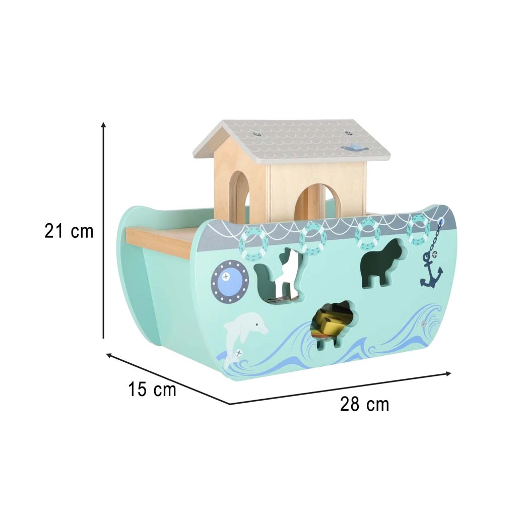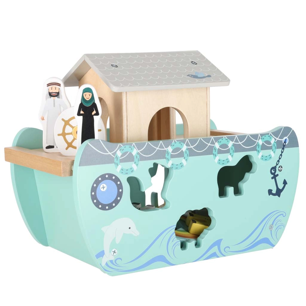 Scoprite un giocattolo in legno che unisce smistatore di forme, gioco libero e narrazione. L’arca con rampa e tetto removibili nasconde un set di figurine di animali e due personaggi, Noè e la moglie: i bambini possono caricare la barca, governarla con il timone e inserire gli animali nelle aperture corrette.