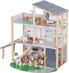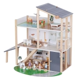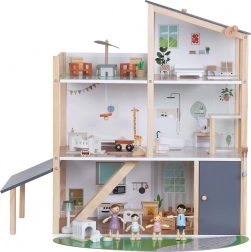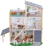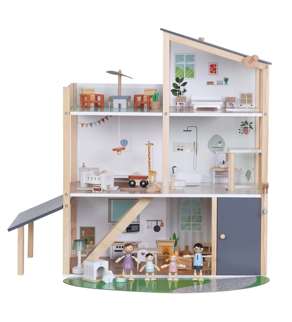 Questa moderna casa in legno offre tutto ciò che i bambini amano: cucina collegata al soggiorno, elegante bagno con vasca, cameretta, camera da letto e ampia terrazza sul tetto. Il design giocoso, i colori tenui e la qualità delle finiture la rendono un bellissimo complemento per la cameretta o la sala giochi.
