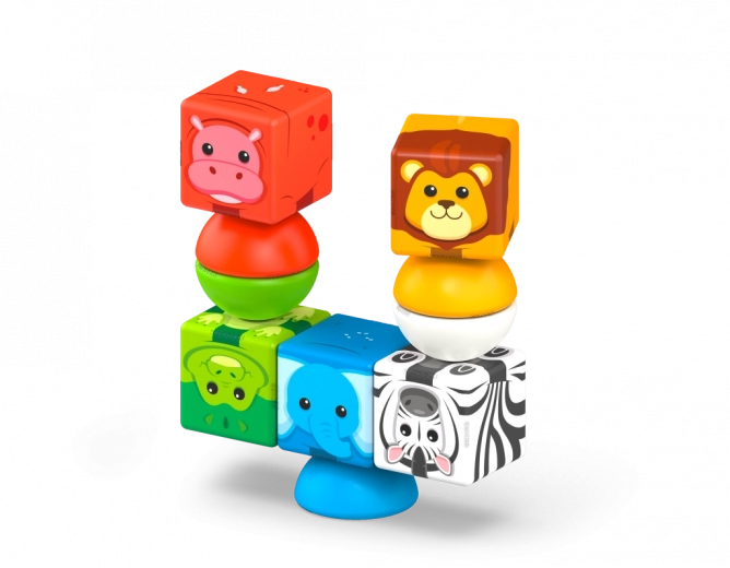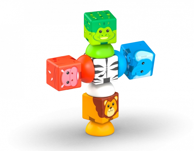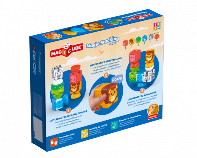 Il set contiene 5 cubetti magnetici con motivi di animali del safari e 5 semisfere magnetiche colorate. I pezzi sono robusti, piacevoli al tatto e progettati per un gioco sicuro già dai 2 anni. La costruzione è pienamente compatibile con gli altri set della linea Magicube, così il mondo della fantasia può crescere senza limiti.