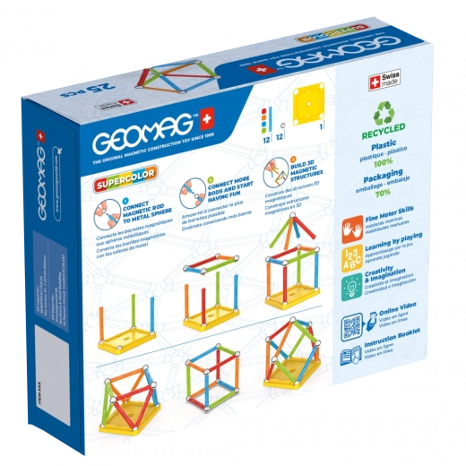 Il set GEOMAG Supercolor stimola fantasia, logica e motricità fine dei bambini. Grazie alle connessioni magnetiche, i bambini possono creare facilmente diverse forme, torri e semplici costruzioni geometriche. I colori vivaci e le solide sfere d'acciaio garantiscono facilità di collegamento e stabilità.