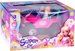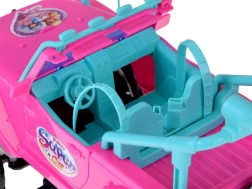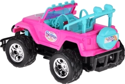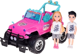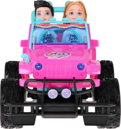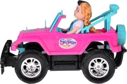 Parti per un safari avventuroso con il fuoristrada rosa per bambole. L'abitacolo aperto con sedili turchesi e cinture regolabili ospita in sicurezza le figurine incluse. Le grandi ruote in gomma e il paraurti donano un look off-road, mentre le luci LED anteriori aggiungono realismo durante la guida.