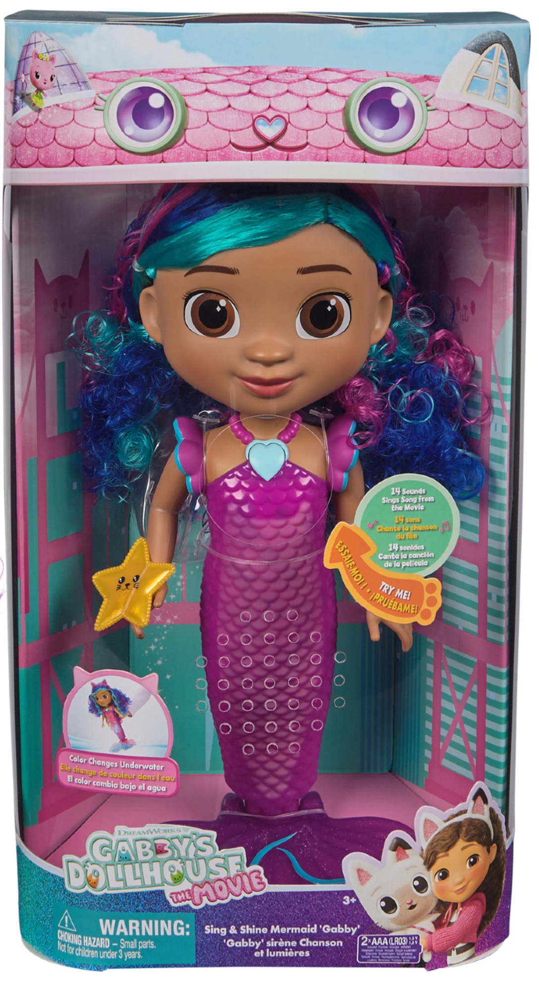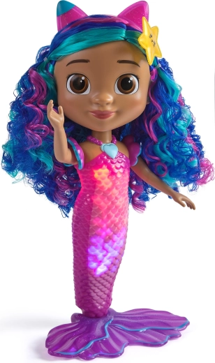 La bambola è impermeabile, così i bambini possono divertirsi anche in acqua. Grazie ai vistosi capelli ondulati blu‑viola, alla fascia rosa con orecchiette da gattino e all’accessorio a forma di stella marina, è perfetta per il gioco creativo, lo styling e l’esposizione. La coda con texture a scaglie di pesce e l’ampia pinna garantiscono una posizione stabile su superfici piane.