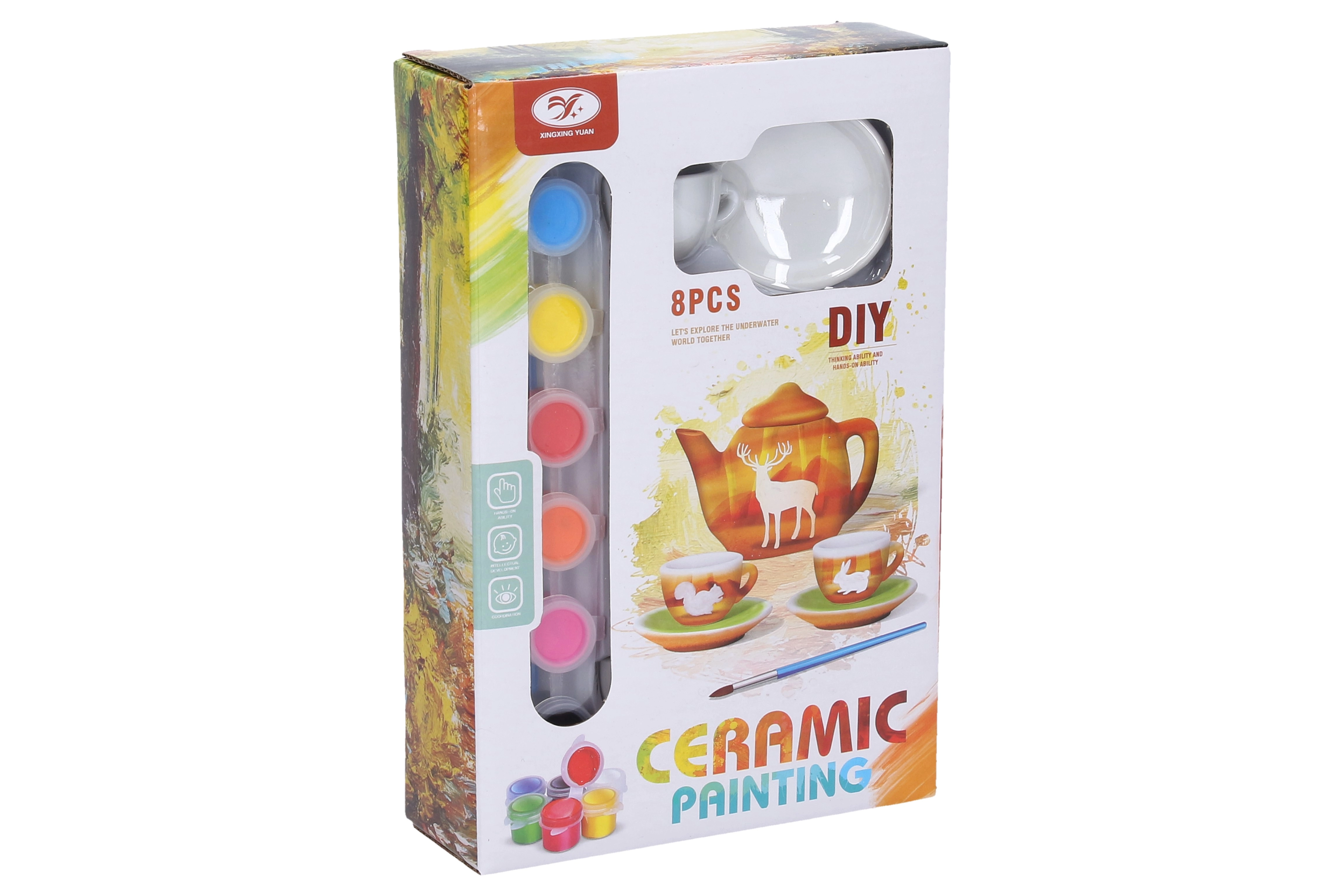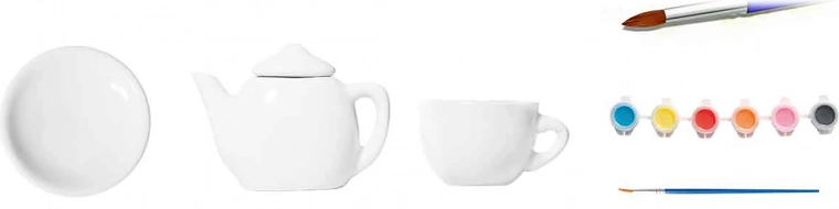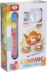 - Confezione completa: teierina con coperchio, 2 tazzine, 2 piattini, 6 colori, pennello