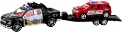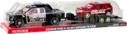 Pick-up della polizia nero traina sul rimorchio un SUV rosso con scritte POLICE ben visibili. Dettagli, lampeggianti e ruote libere stimolano il gioco di fantasia.