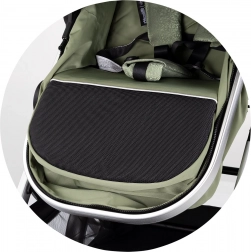 Lo schienale reclinabile in 3 posizioni, la cappottina regolabile con parasole amovibile e finestra e il coprigambe imbottito offrono il massimo comfort al bambino con ogni clima. La dotazione di sicurezza include la cintura a 5 punti con morbide imbottiture, il maniglione removibile con rivestimento in eco-pelle, il freno posteriore collegato e il laccetto di sicurezza sul maniglione. L'ampio cestello e la borsa fasciatoio facilitano le uscite quotidiane.