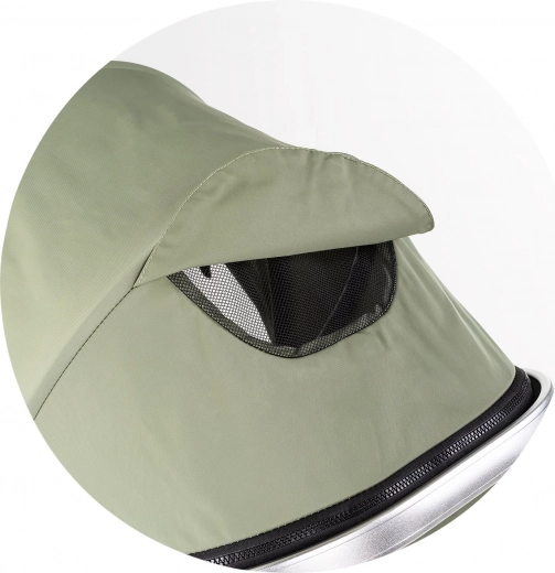 Cappottina regolabile con parasole e finestra, maniglione in eco-pelle regolabile in altezza, grande cestello, coprigambe e laccetto di sicurezza sul maniglione.
