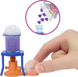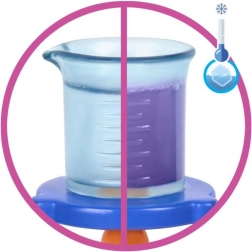 Il set include una speciale beuta con effetto termocromico per giocare con il cambio di colore e altri strumenti di laboratorio che favoriscono motricità fine, creatività e curiosità. La bambola indossa un abito tie-dye, sneakers e un camice da laboratorio bianco: pronta per ogni avventura scientifica.