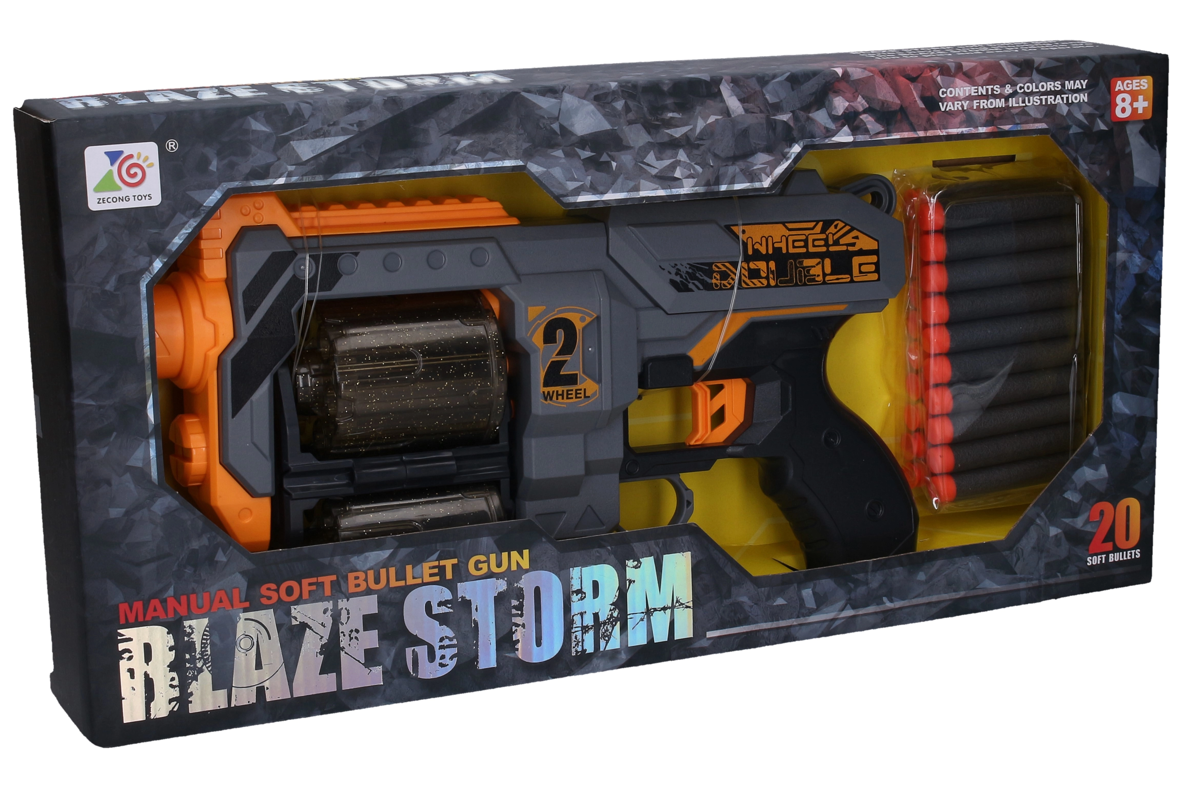 La Pistola Wheel Double con proiettili in spugna offre ai bambini tanto divertimento senza rischi. Grazie alla combinazione di proiettili standard e proiettili con ventosa, potrete divertirvi sia con sparatorie d’azione sia con tiri di precisione su superfici lisce. La struttura robusta e il chiaro manuale illustrato sul retro della confezione facilitano il primo utilizzo.