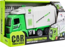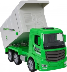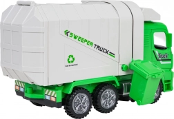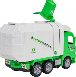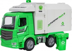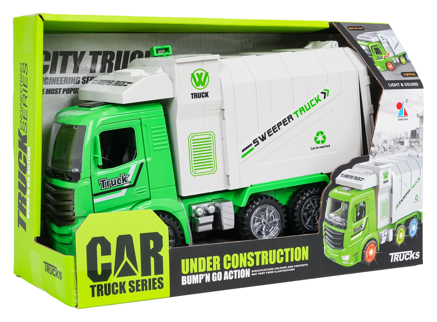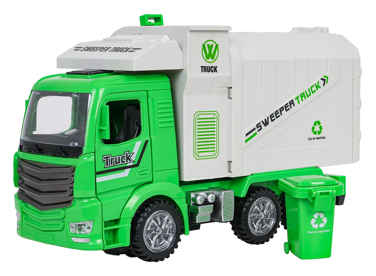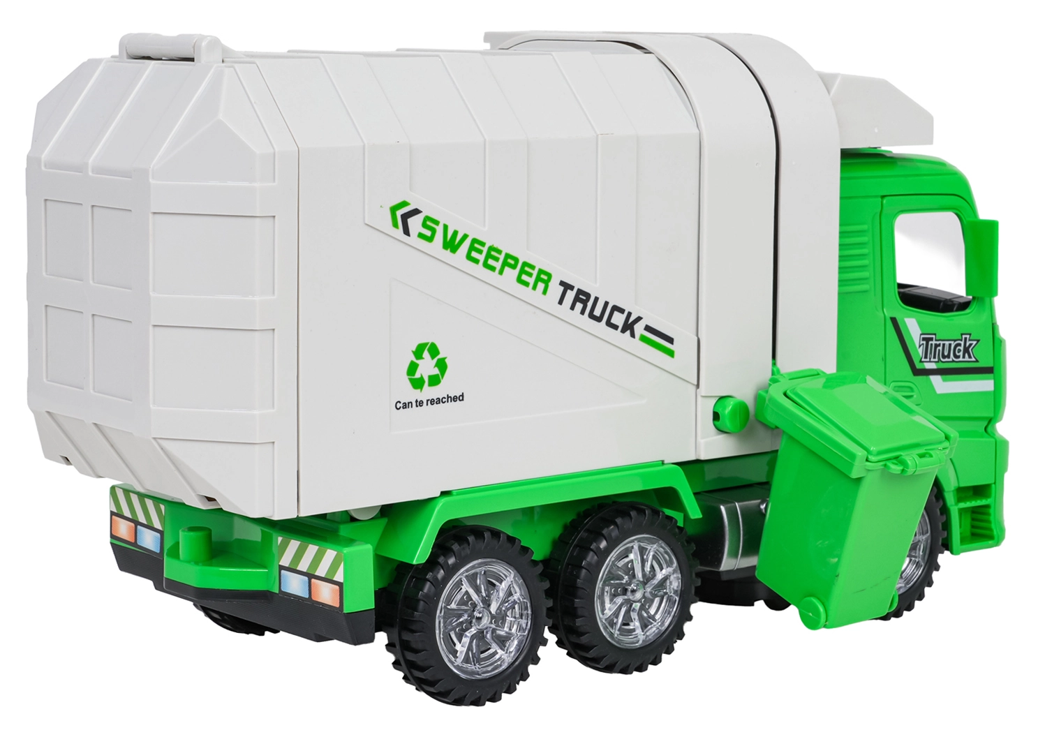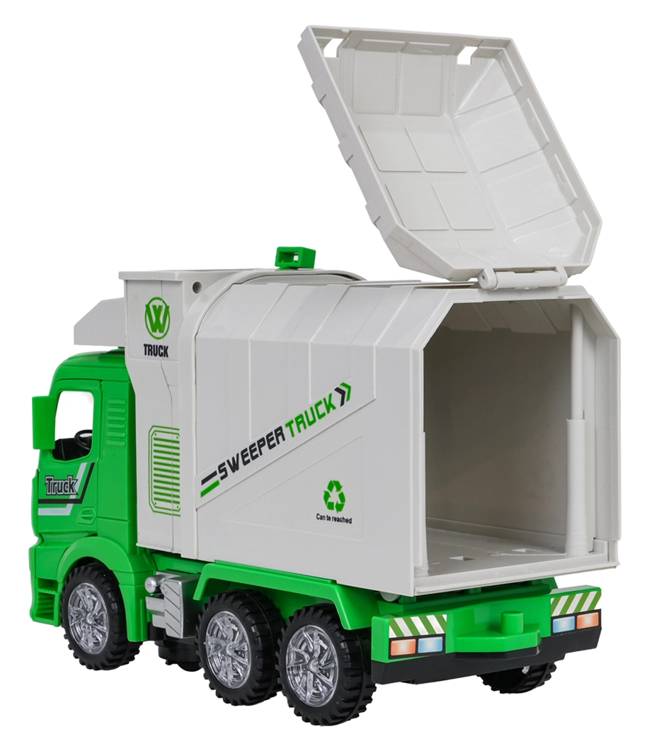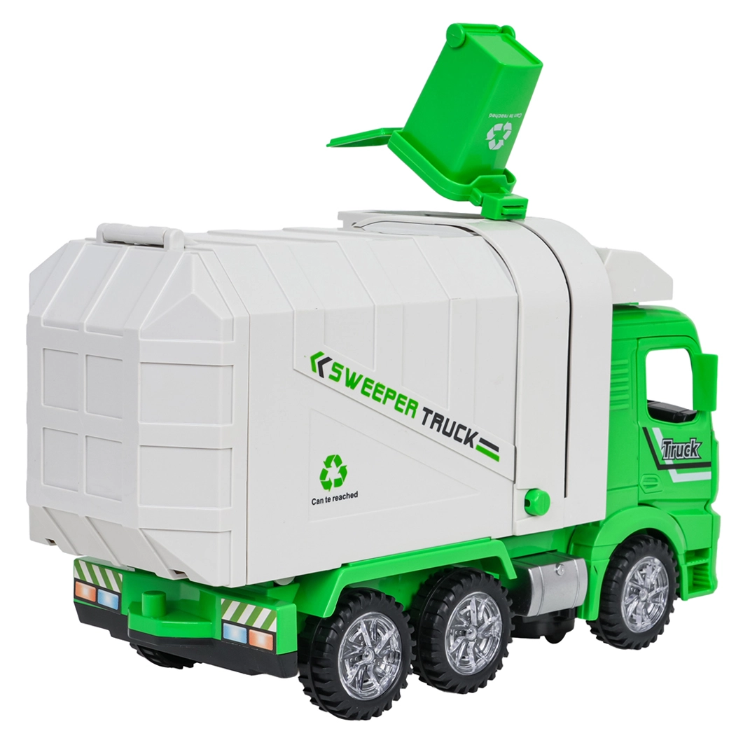 Gli effetti sonori come guida, frenata, clacson e melodia allegra rendono il gioco realistico. Il cestino per i rifiuti incluso si aggancia facilmente al lato del camion e consente di svuotarne il contenuto nella tramoggia. Il giocattolo è alimentato da 3× AA 1,5 V (batterie non incluse).