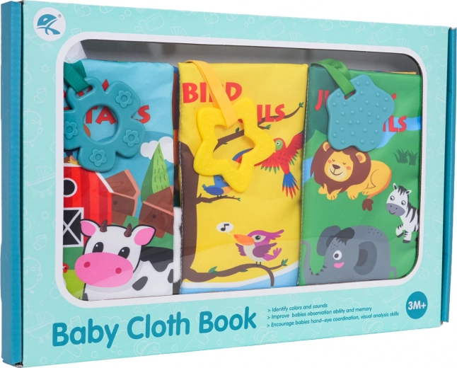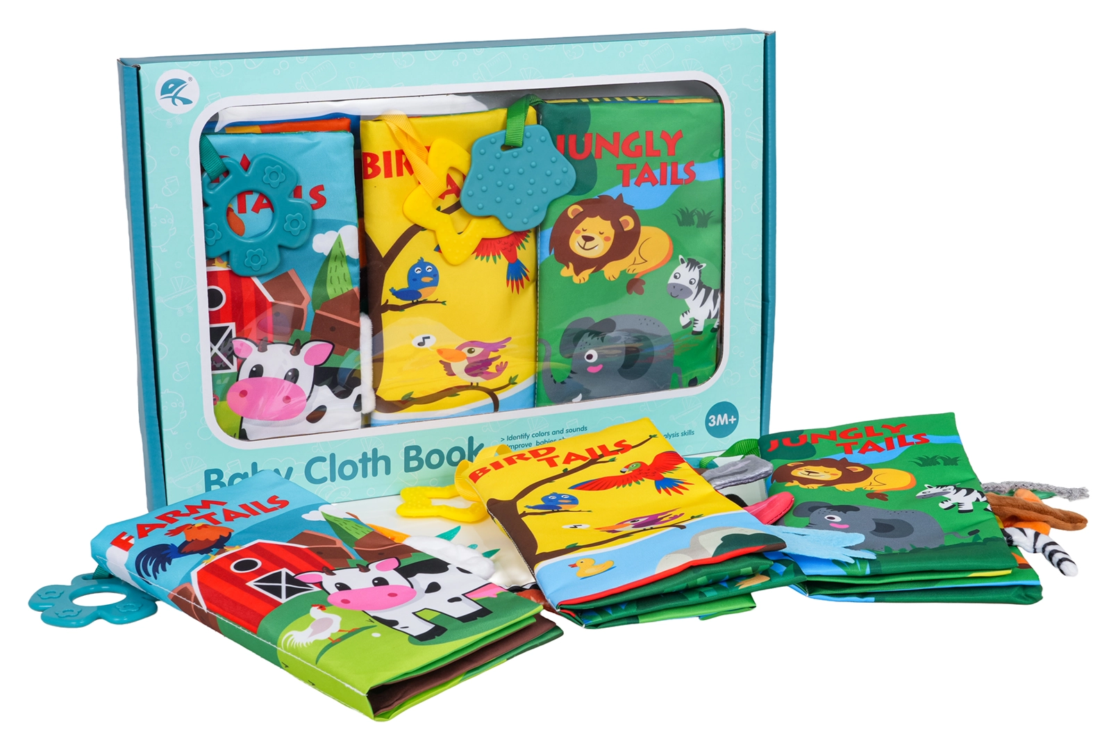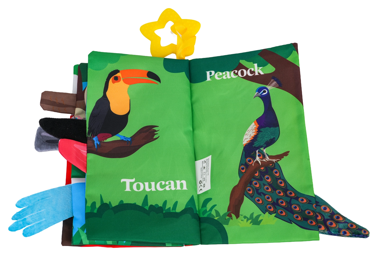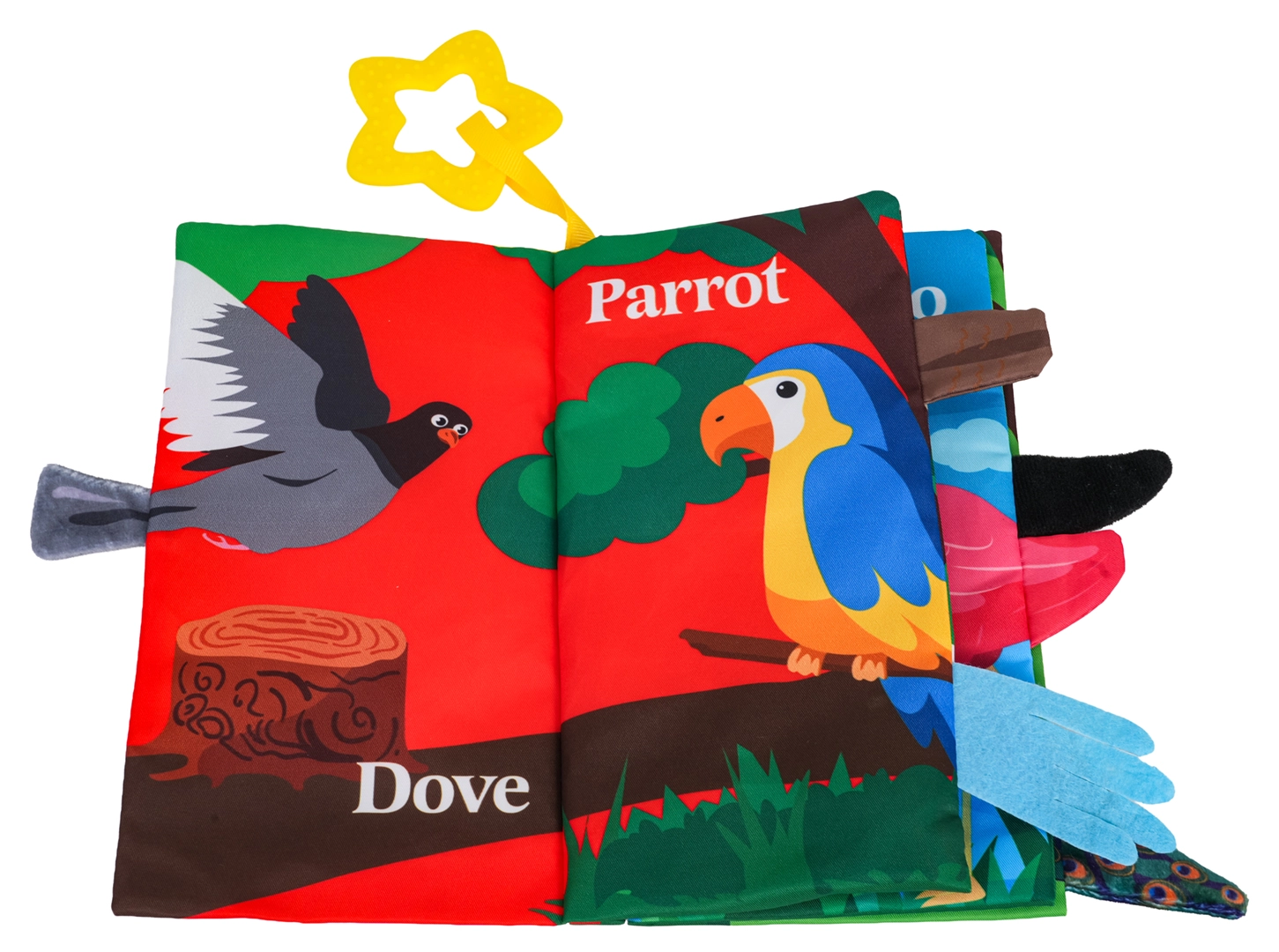 Scopri un adorabile set di tre libri di stoffa per bambini dai 3 mesi, che sviluppano i sensi e la motricità fine. Ogni libretto offre pagine fruscianti, morbide texture, codine di animaletti sporgenti e un pratico mordigomme/clip per il fissaggio. I temi fattoria, uccelli e giungla affascinano con illustrazioni colorate e semplici didascalie degli animali in inglese. I libri di stoffa sono leggeri, impermeabili e facili da pulire: ideali a casa e in viaggio.