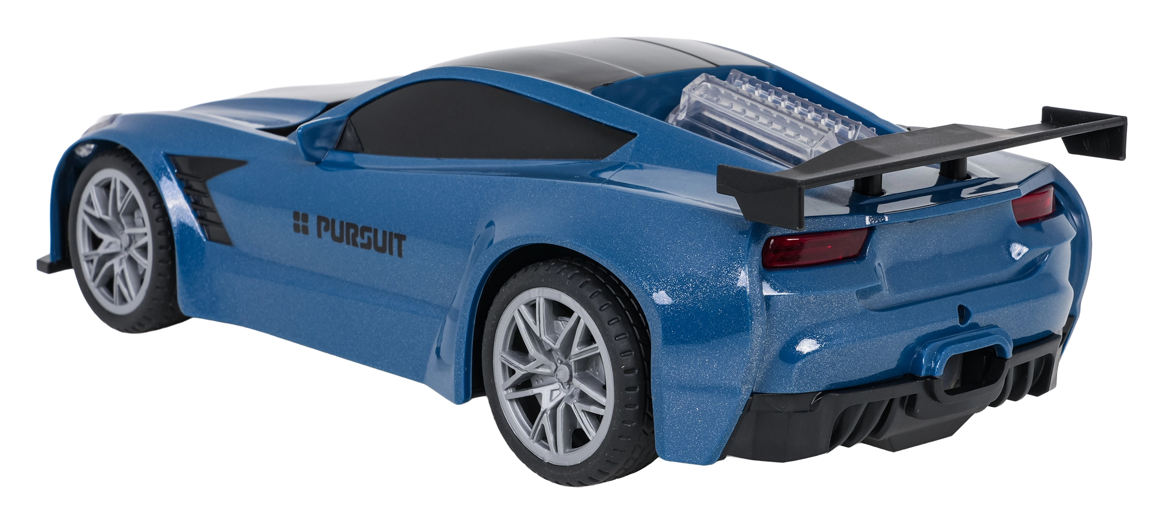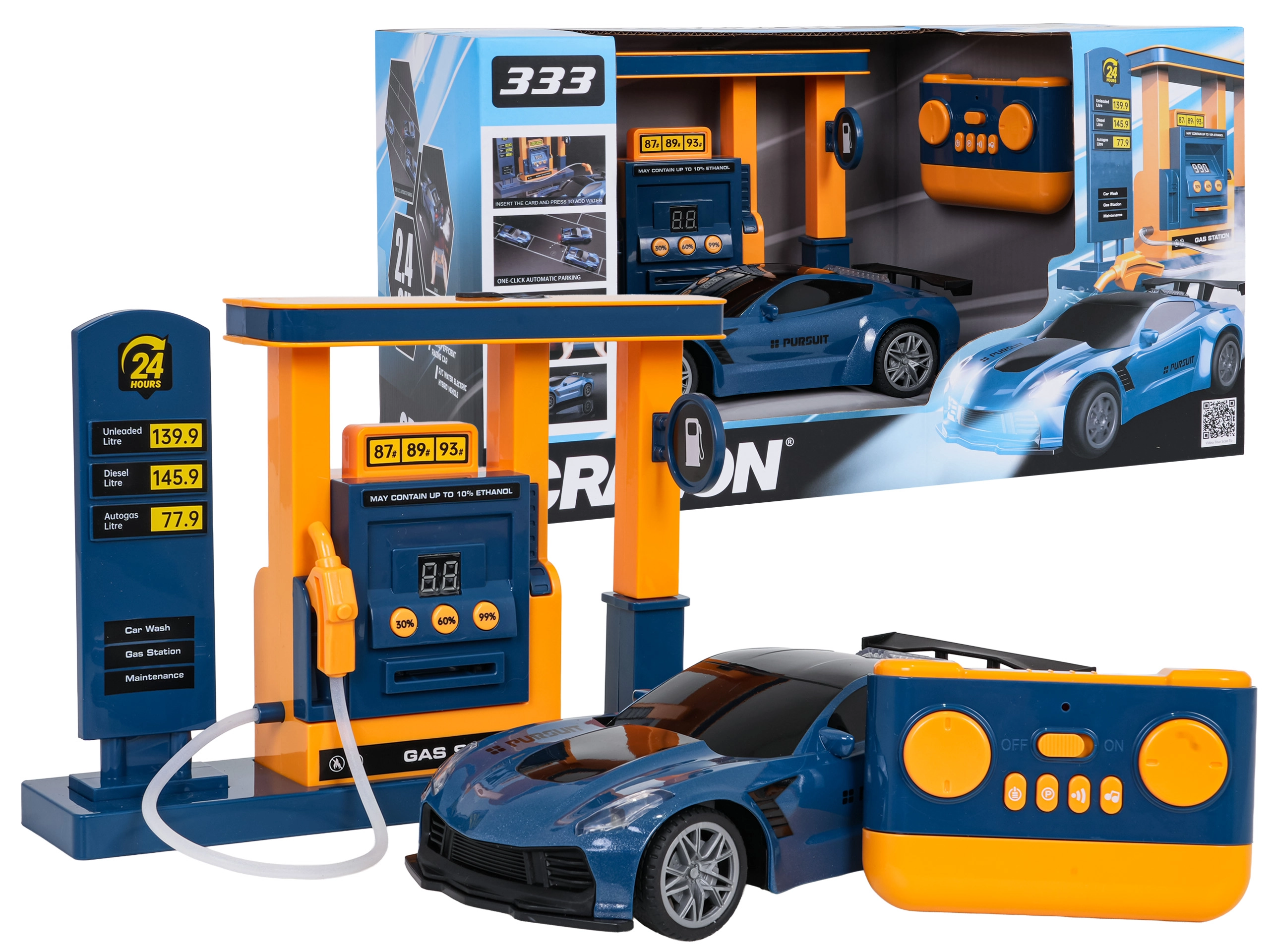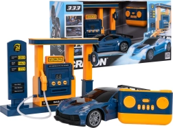 L’auto è controllata a 2,4 GHz – senza interferenze, fluida e in tutte le direzioni: avanti, indietro, destra e sinistra. Non mancano luci anteriori e posteriori, carrozzeria resistente, pneumatici in gomma con buona aderenza e regolazione della direzione. La stazione di rifornimento offre effetti luminosi e sonori del rifornimento e indicazione del livello di “carburante”. Per un gioco confortevole è possibile disattivare i suoni e utilizzare il parcheggio automatico dal radiocomando.