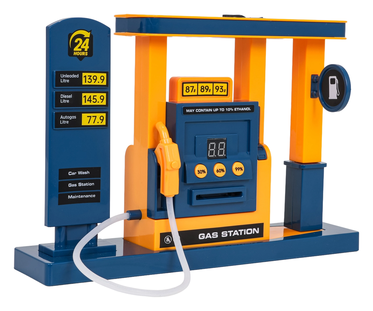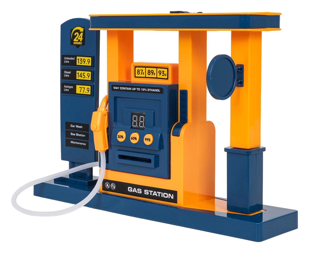 Riempi la stazione con acqua tramite pipetta, inserisci la carta, scegli il livello e fai rifornimento. Il display mostra la percentuale di “carburante” e il suono rende il gioco autentico.