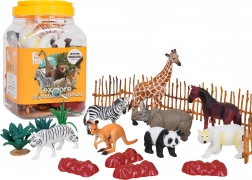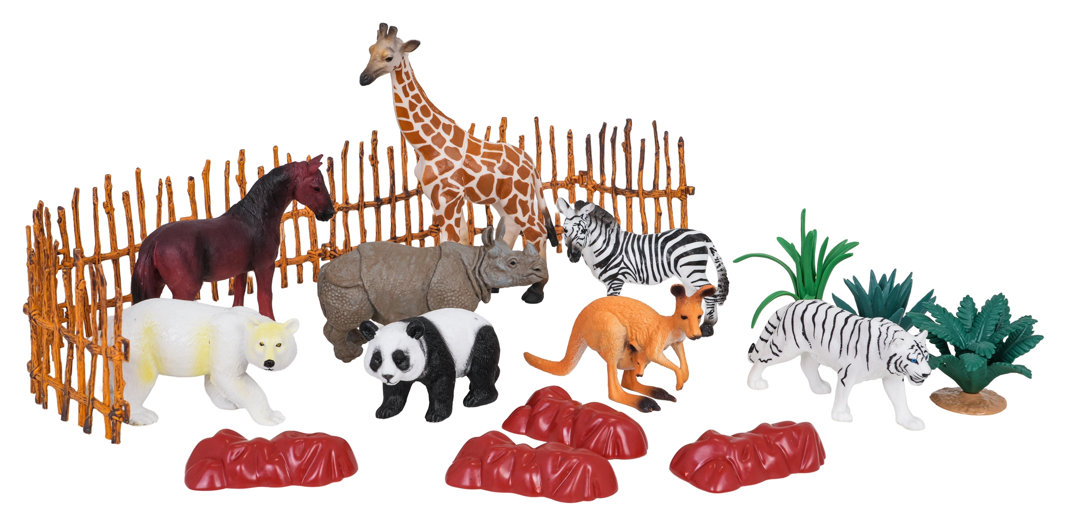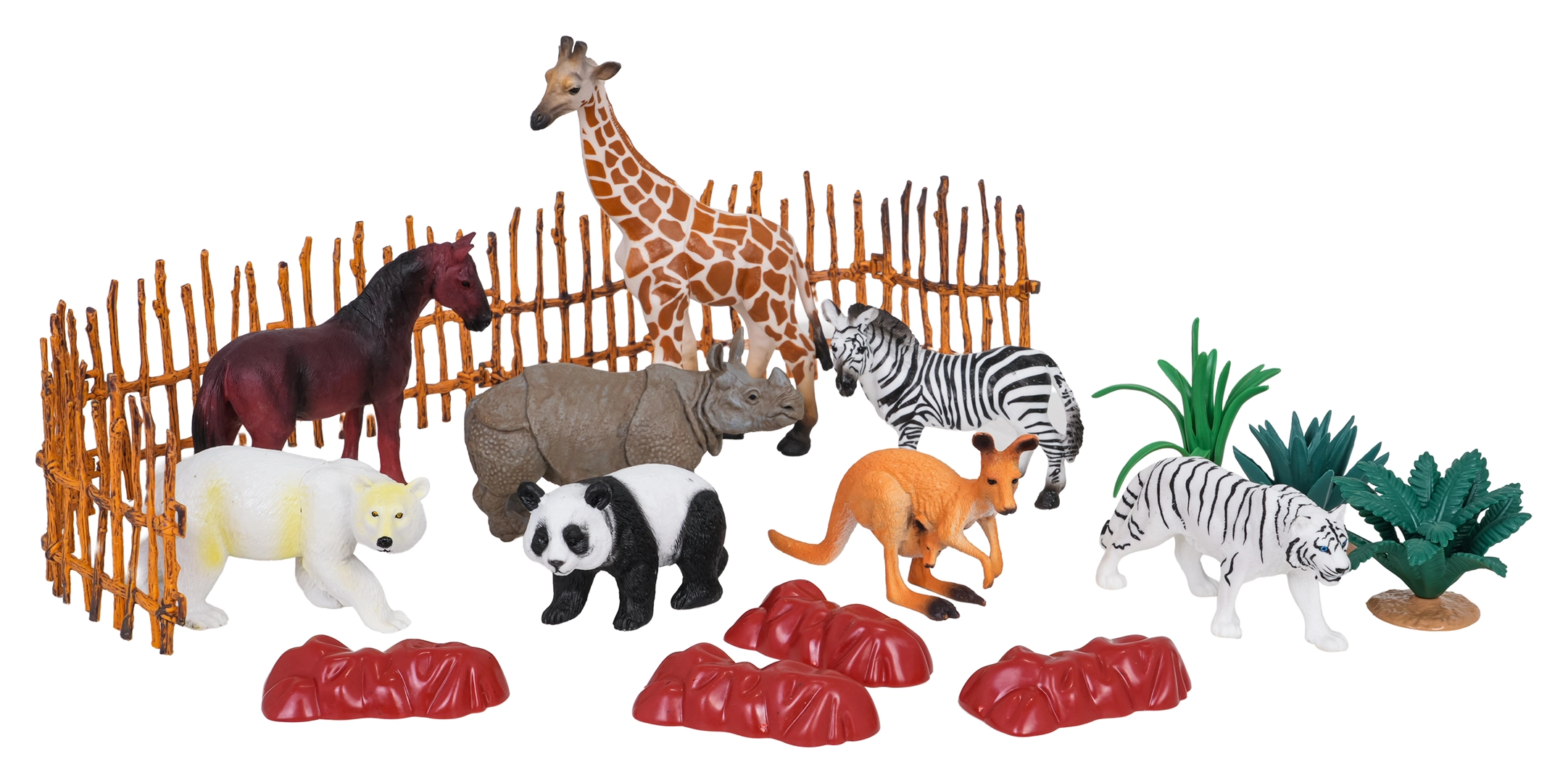 - Contenitore in plastica con manico (imballo); figurine: canguro, panda, orso polare, tigre, rinoceronte, zebra, cavallo, giraffa; 3× pianta; 4× roccia; 7× parte di recinzione; libretto con descrizione degli animali (EN)