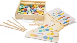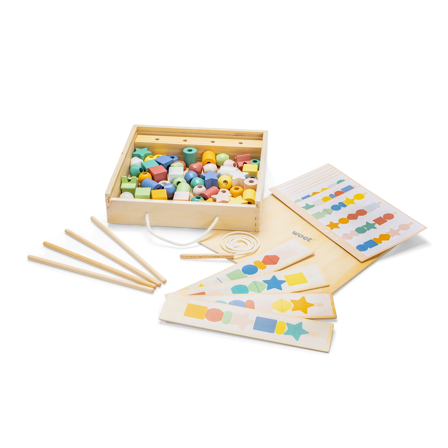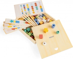- Scatola di legno con coperchio, 56 perline colorate, 8 cartoncini fronte-retro con schemi, 4 supporti di classificazione con cartoncini, cordino per infilare