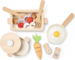 - Padella, pentola con coperchio, 2× cucchiaio di legno, saliera, pepiera, carota con velcro (3 parti), altri ingredienti in legno