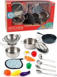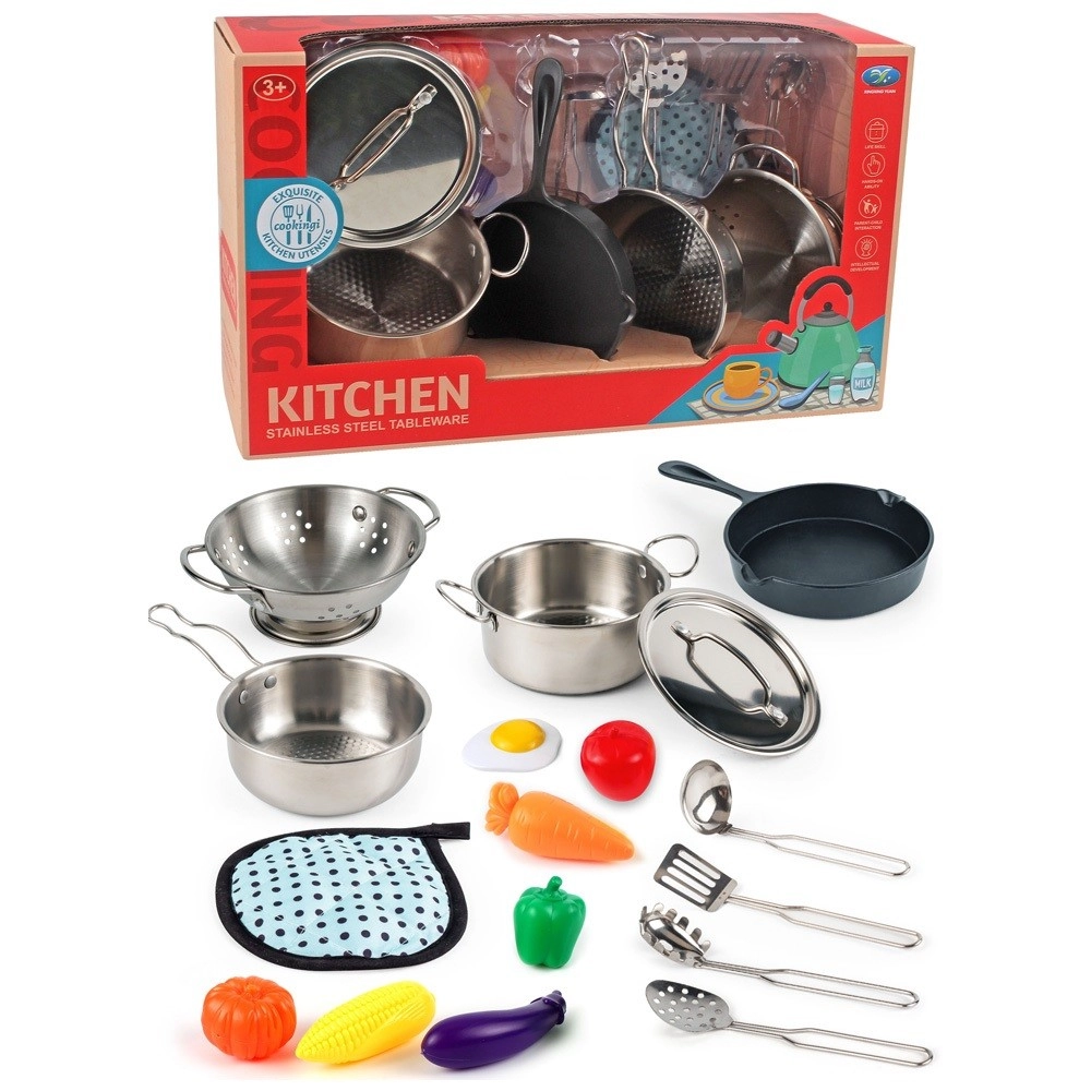 Scopri il divertente set da cucina in metallo per piccoli chef con un totale di 17 elementi. Include pentola, padella, coperchi, scolapasta, utensili da cucina, verdure di plastica e tappetino in tessuto. Un ottimo giocattolo per lo sviluppo della creatività, della motricità fine e per giocare a fare il cuoco.
