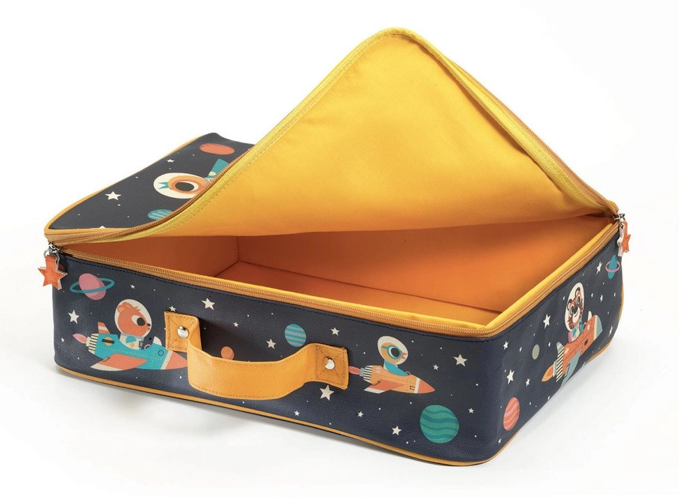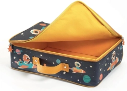 Pratica e stilosa valigetta per bambini con motivo spaziale del brand DJECO che farà felici i piccoli viaggiatori. Realizzata in robusta tela, ha una superficie impermeabile, due scomparti e 2 tasche interne per riporre gli oggetti in modo ordinato. Grazie alla struttura leggera, alla maniglia comoda e alla cerniera a doppio cursore di qualità si trasporta e si usa con facilità.