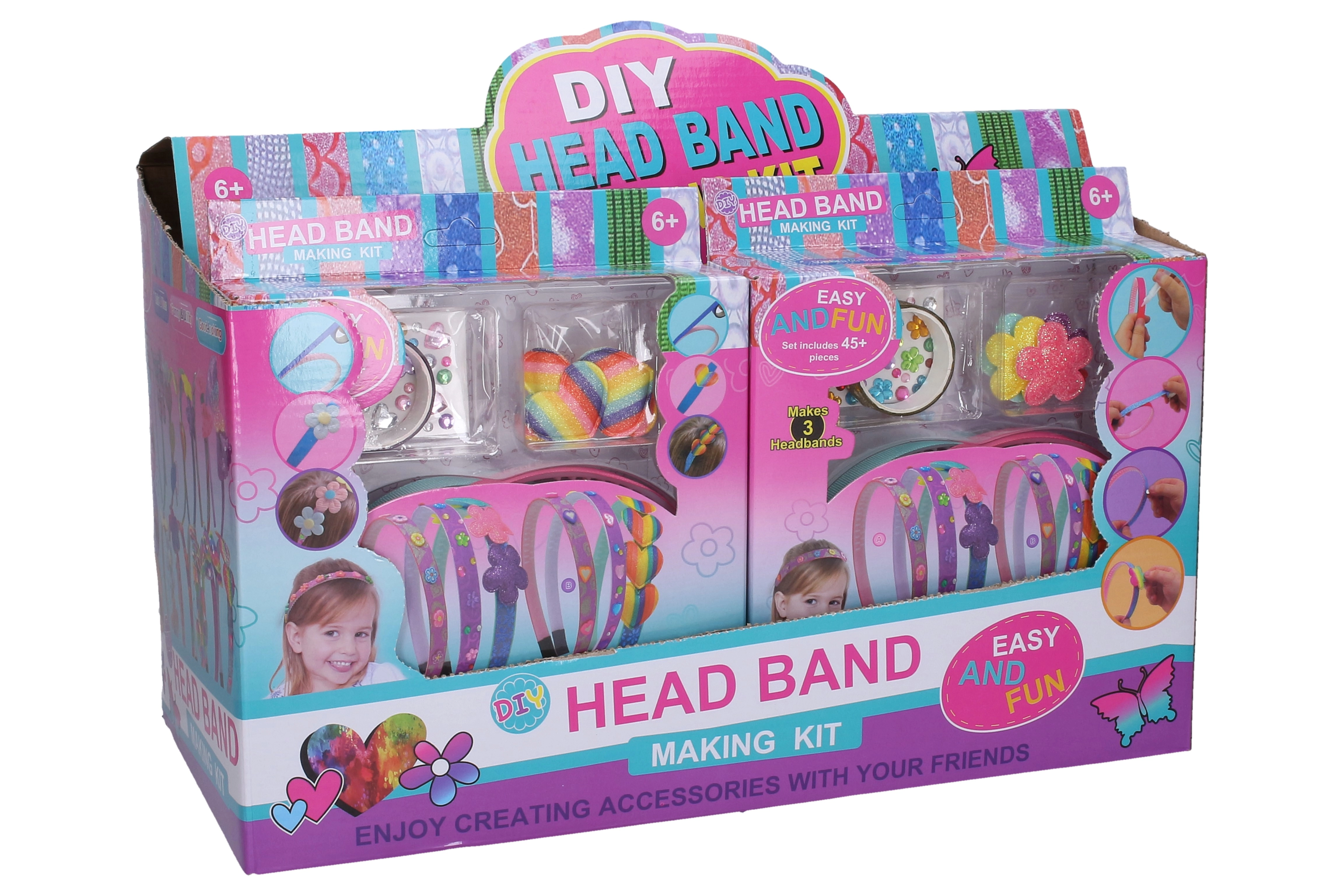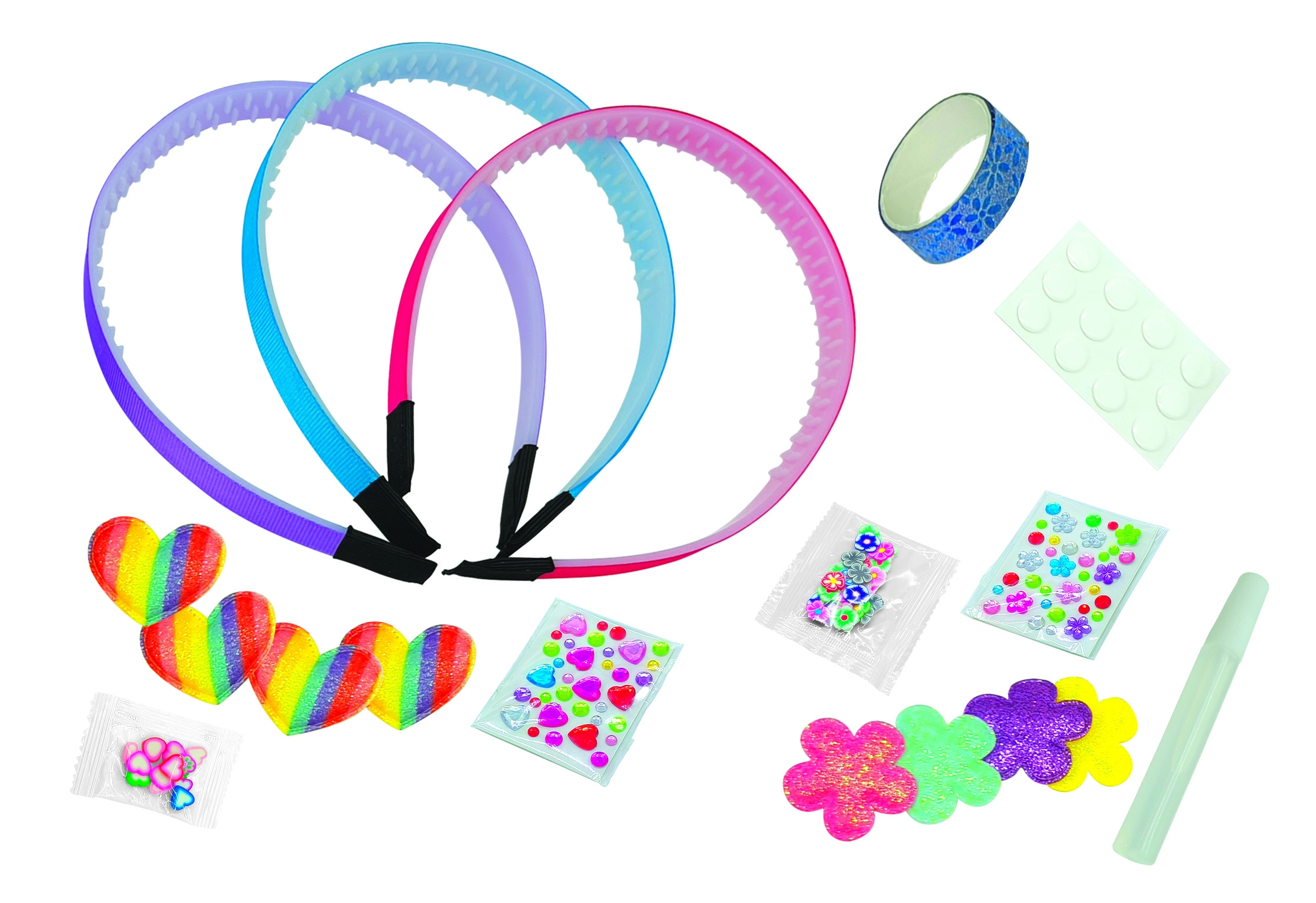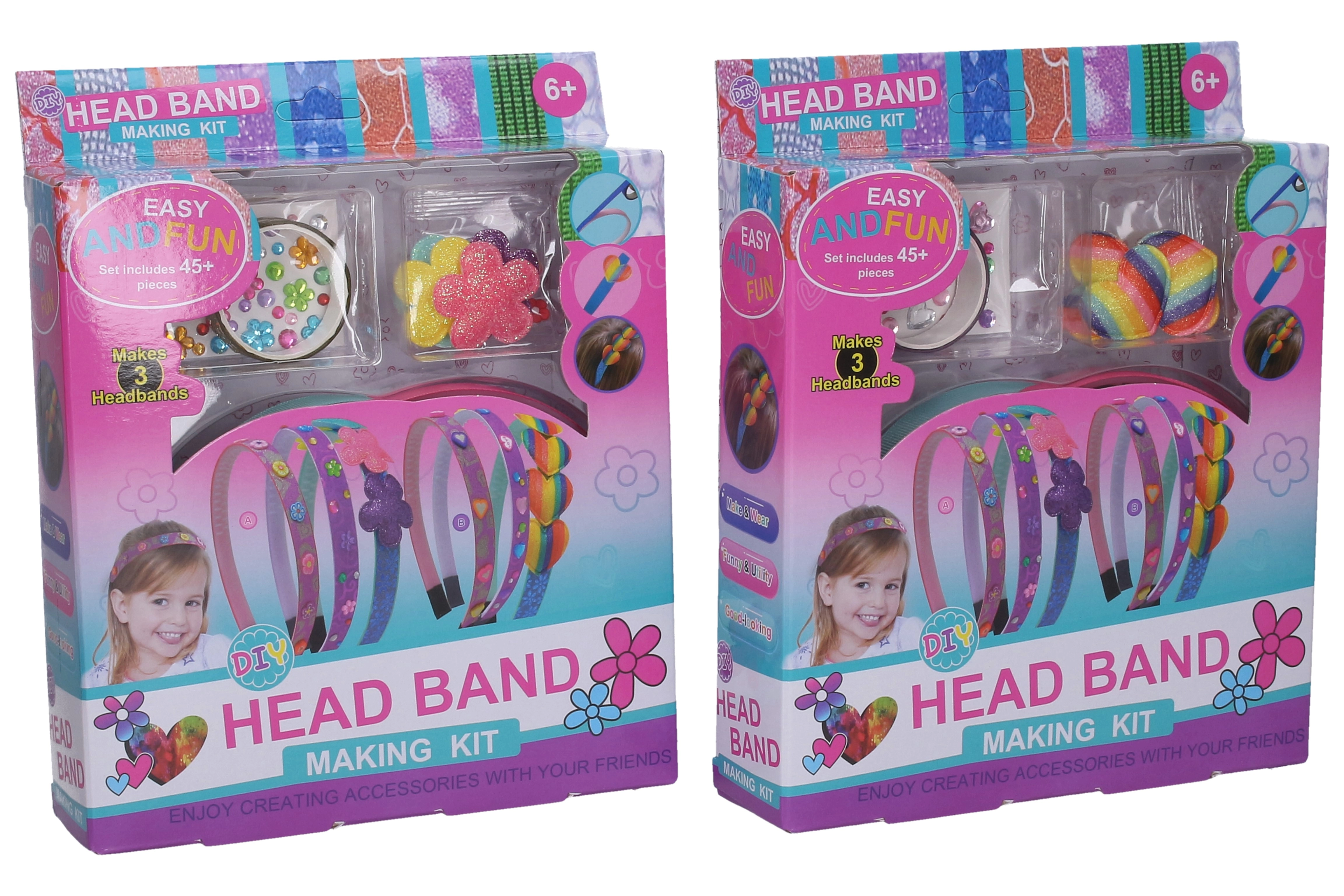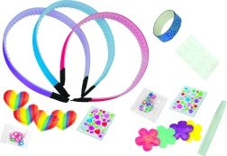 Il set contiene cerchietti di plastica di base e un'ampia scelta di accessori, così i bambini possono progettare facilmente tre stili diversi – dai delicati motivi floreali a quelli scintillanti e giocosi.