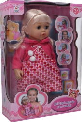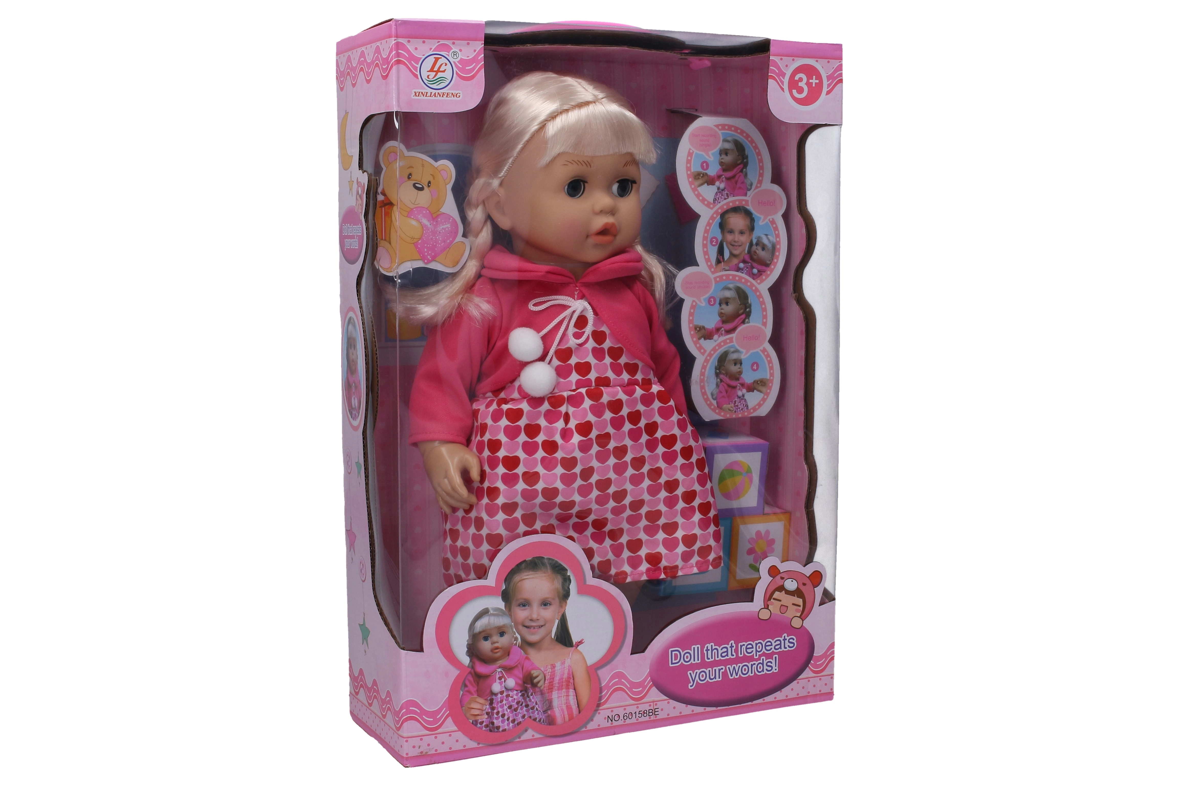Divertente bambola che ripete ciò che dici! Premendo la mano destra parte la registrazione e premendo la mano sinistra la bambola riproduce il tuo messaggio. Dimensione 40 cm. Giocattolo interattivo per lo sviluppo del linguaggio e il divertimento. Facile da usare grazie ai pulsanti nelle mani. Batterie 2× AA non incluse.