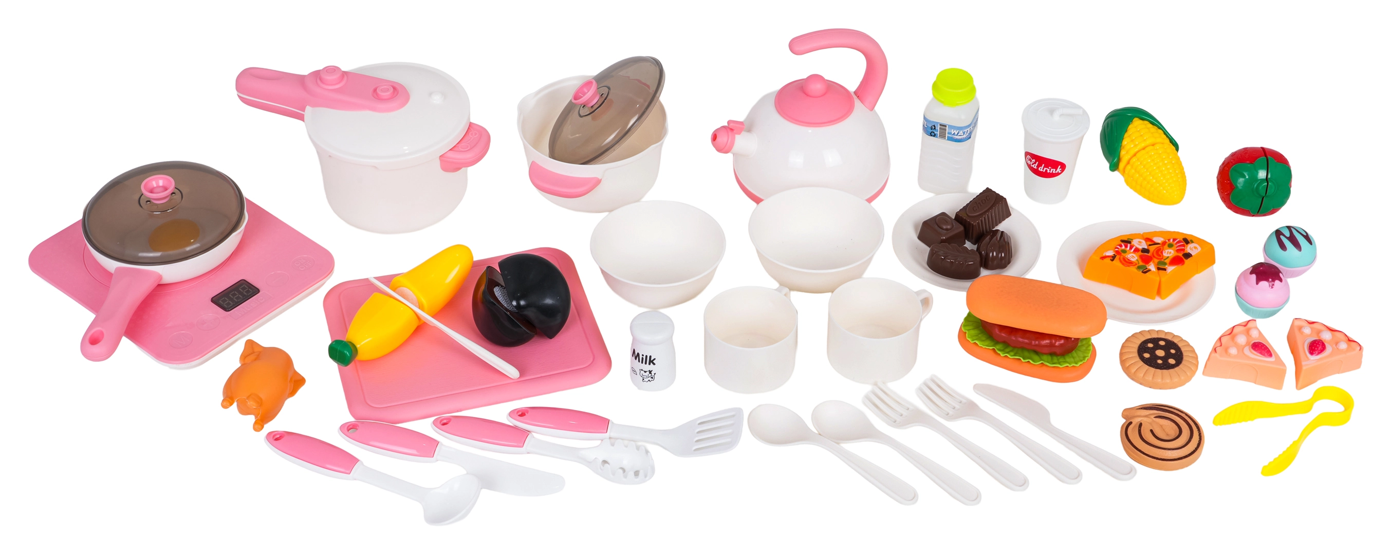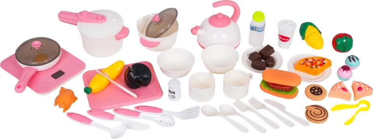 Il set è riccamente equipaggiato – dalle stoviglie e posate a padella, pentola a pressione, teiera fino a alimenti con chiusura a strappo (frutta, verdura, pizza, dessert). Non mancano portadolci, vani portaoggetti, ganci per utensili e scolapiatti. La cucina favorisce così il gioco di ruolo, lo sviluppo della motricità fine e le abilità sociali.