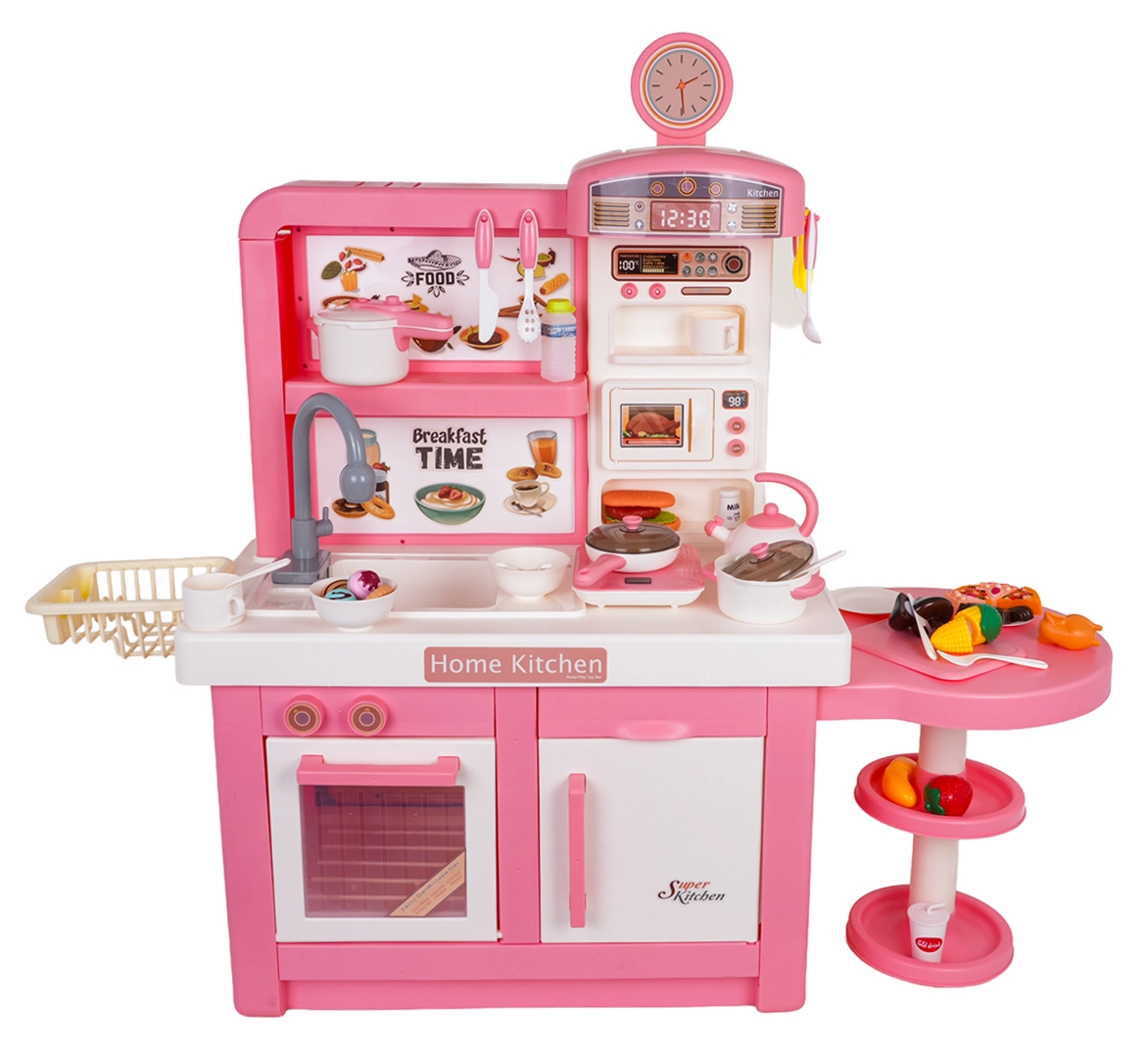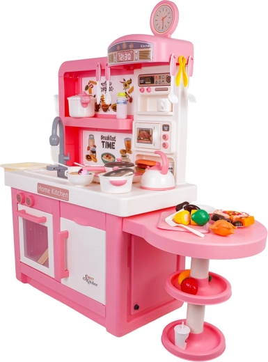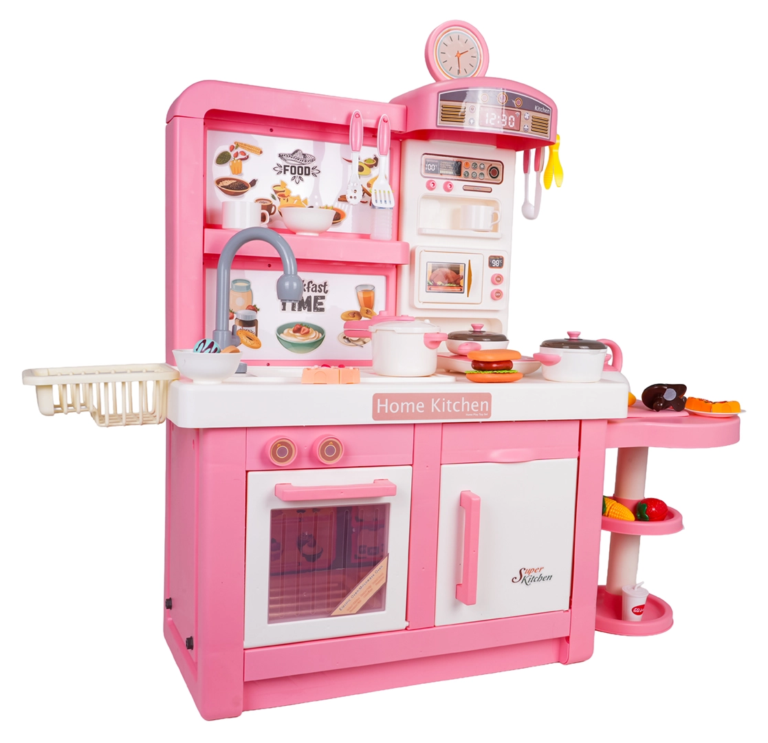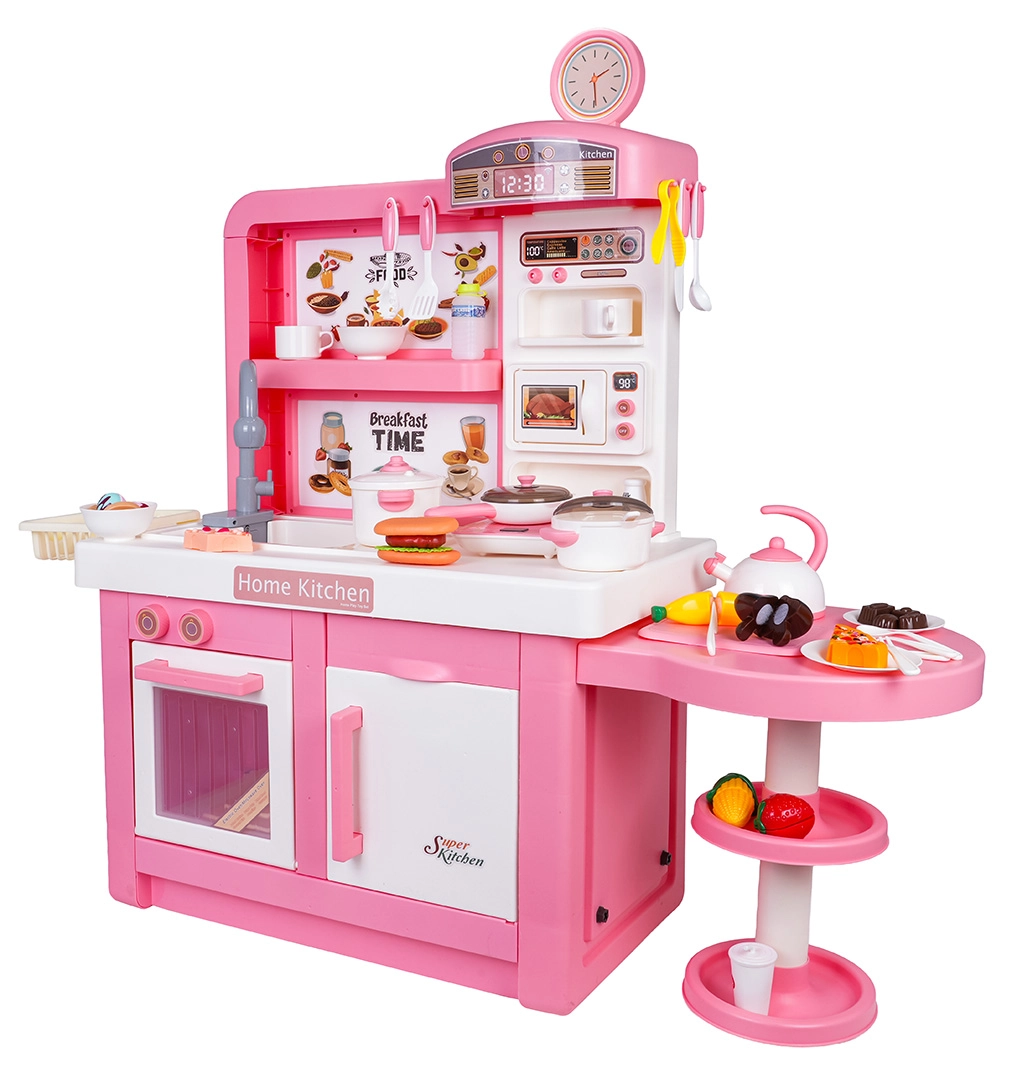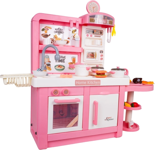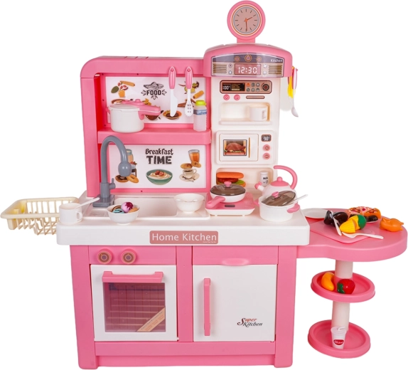 Questa cucina interattiva in combinazione rosa‑bianco è progettata per un gioco sicuro e creativo. I bambini apprezzeranno elementi realistici come forno a microonde, lavello con rubinetto, piano cottura a induzione, forno, macchina del caffè e “frigorifero”. Le manopole girevoli emettono suoni di cottura e frittura, il bruciatore illuminato con display della temperatura intensifica l’atmosfera e da una pentola fuoriesce delicato vapore freddo.