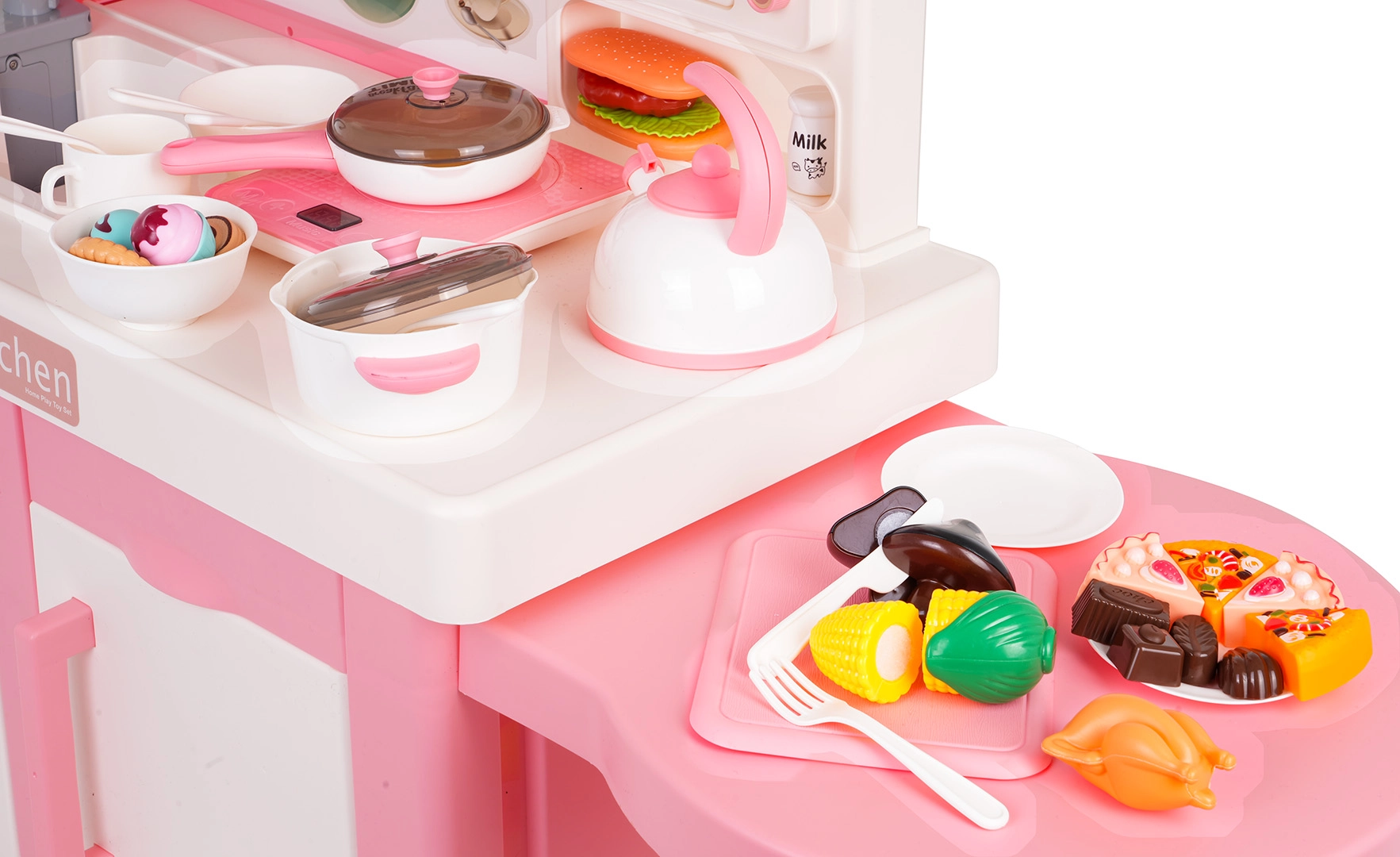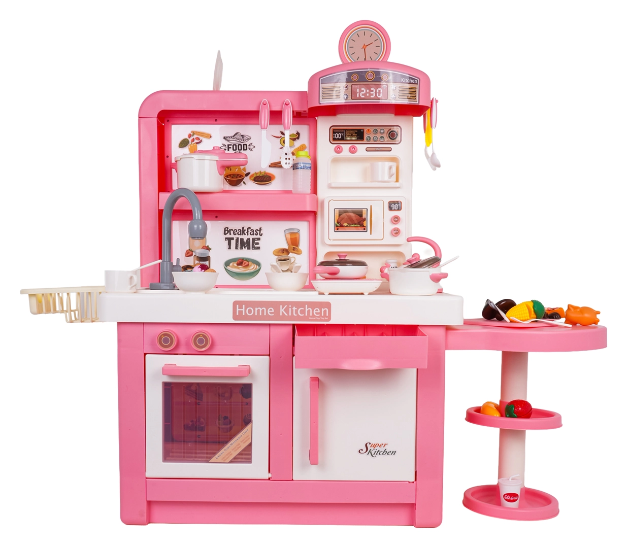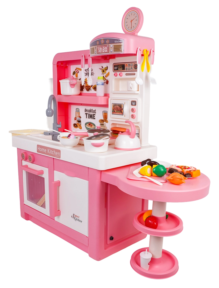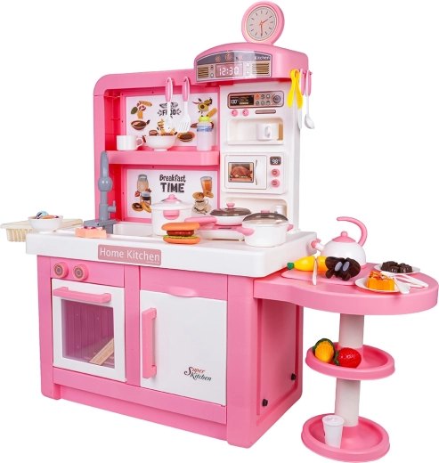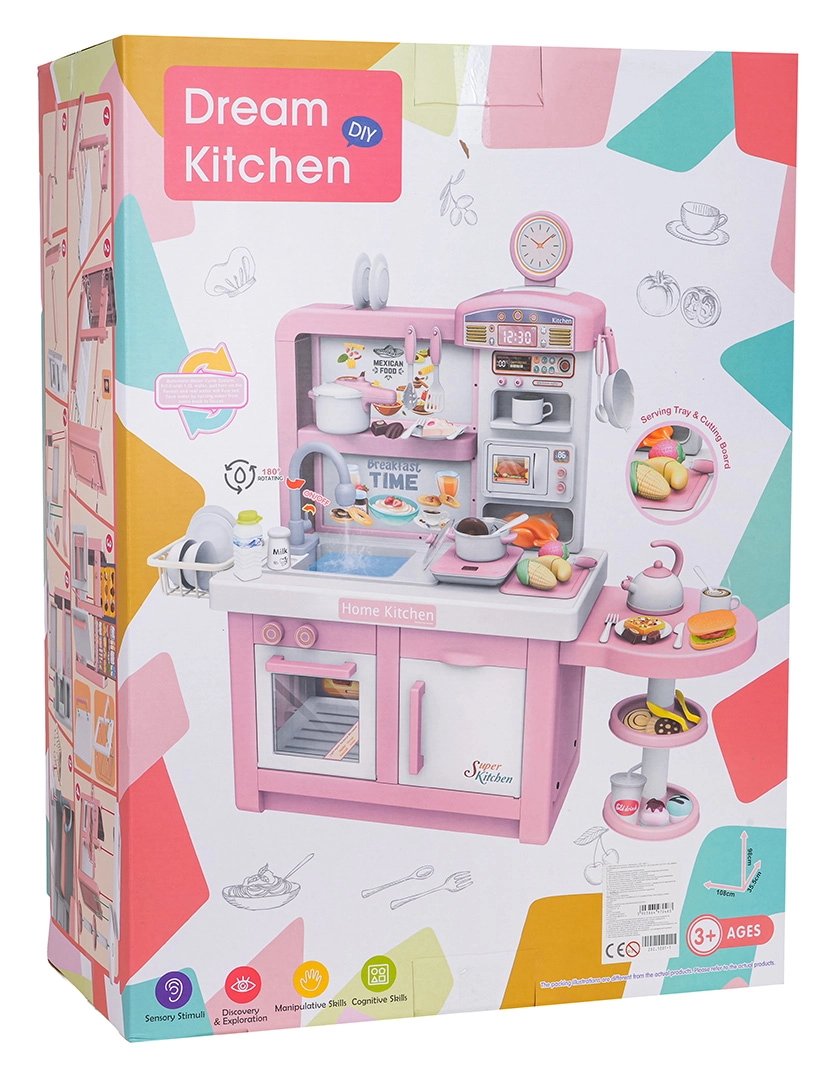 Questa cucina interattiva in combinazione rosa‑bianco è progettata per un gioco sicuro e creativo. I bambini apprezzeranno elementi realistici come forno a microonde, lavello con rubinetto, piano cottura a induzione, forno, macchina del caffè e “frigorifero”. Le manopole girevoli emettono suoni di cottura e frittura, il bruciatore illuminato con display della temperatura intensifica l’atmosfera e da una pentola fuoriesce delicato vapore freddo.