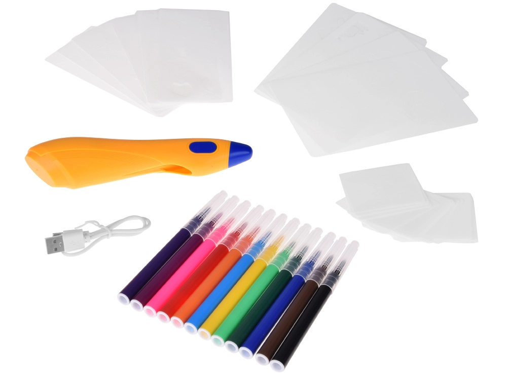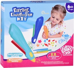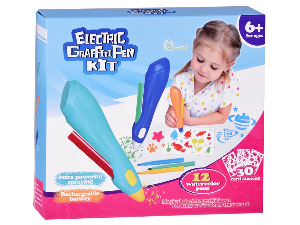 - Penna aerografo elettrica, 30 stencil, 12 pennarelli colorati, cavo USB
