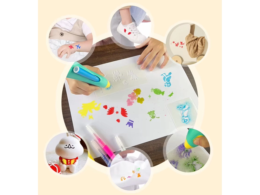 Penna aerografo creativa per bambini trasforma i normali pennarelli in mini “spray” e crea moderni spray art e effetti graffiti. Basta inserire il pennarello scelto, premere il pulsante e dipingere con stencil riutilizzabili o a mano libera. Ricarica USB‑C, forma ergonomica e un set ricco di stencil e pennarelli sostengono creatività e motricità fine.
