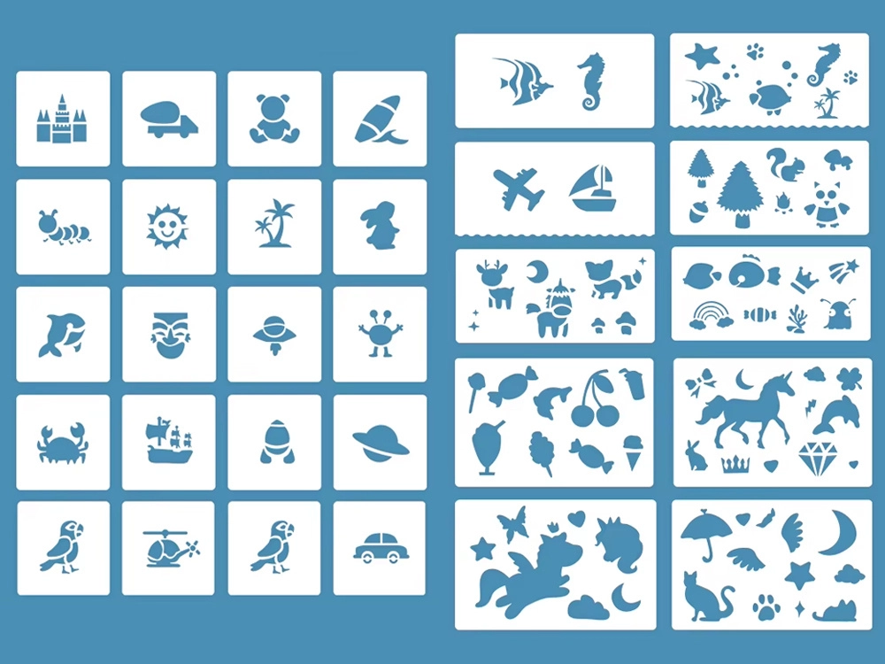 Gli stencil in plastica lavabili si sciacquano facilmente con acqua e si possono riutilizzare più e più volte – dagli animali alle stelle e altri pattern.