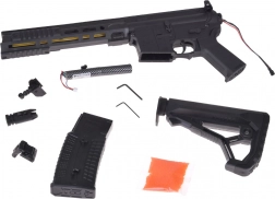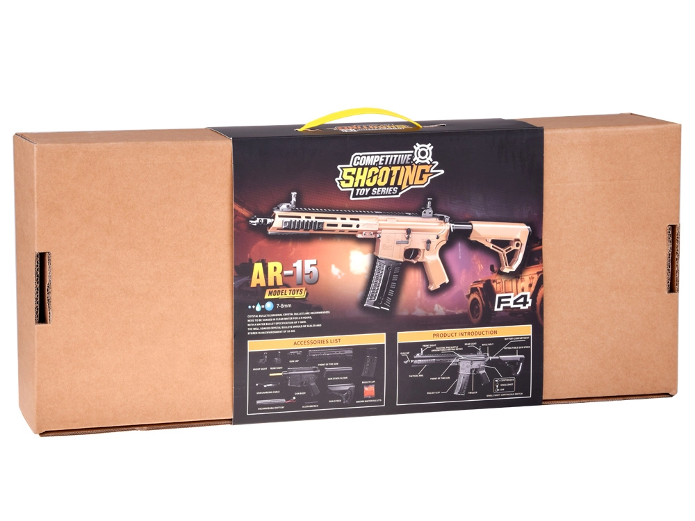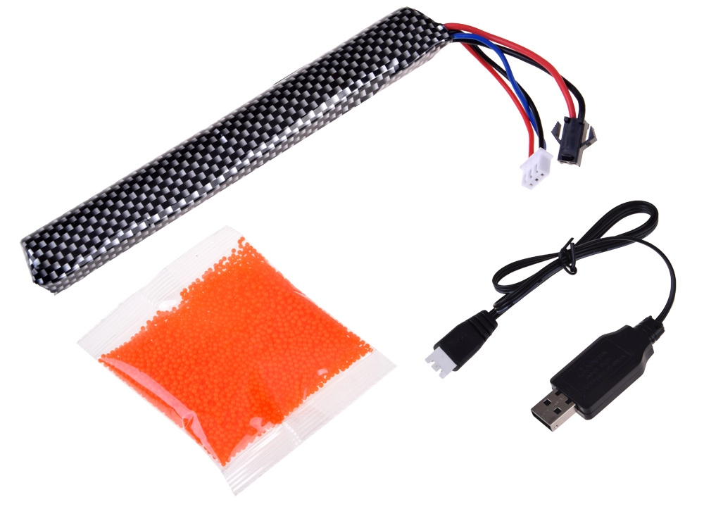 - pistola a gel F4, caricatore, batteria 7,4 V 1200 mAh, cavo USB, sacchetto di palline di gel da preparare, chiave a brugola, soppressore (decorativo), 2× mire, calcio