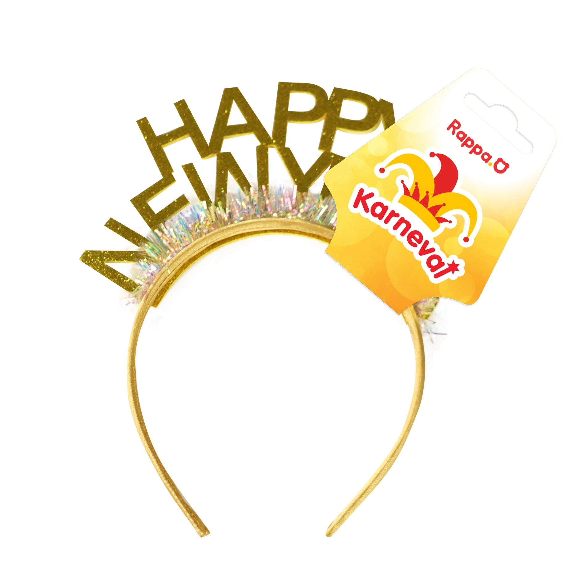 Elegante cerchietto da party in raffinata tonalità dorata con la scritta scintillante HAPPY NEW YEAR, che aggiunge un tocco festivo al tuo outfit. Accessorio ideale per il veg­lione di Capodanno, feste e shooting a tema.