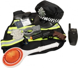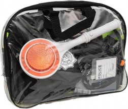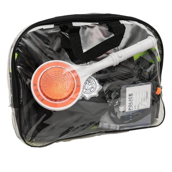 - gilet catarifrangente, berretto, “paletta” della polizia (LED), ricetrasmittente (suono di sirena), rivoltella, distintivo, manette con chiavi, tesserino identificativo, occhiali, fischietto