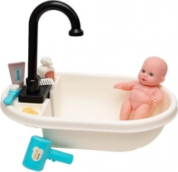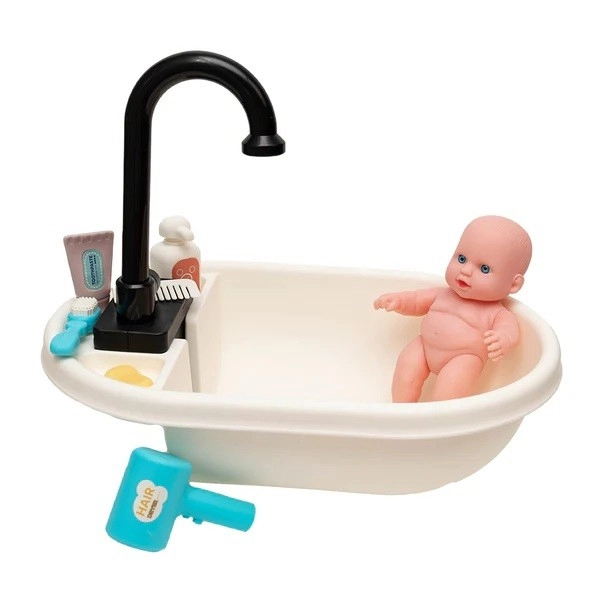 Vaschetta con doccia, bambola, mini phon, boccetta di shampoo, sapone, pettine, spazzolino da denti, tubetto di dentifricio