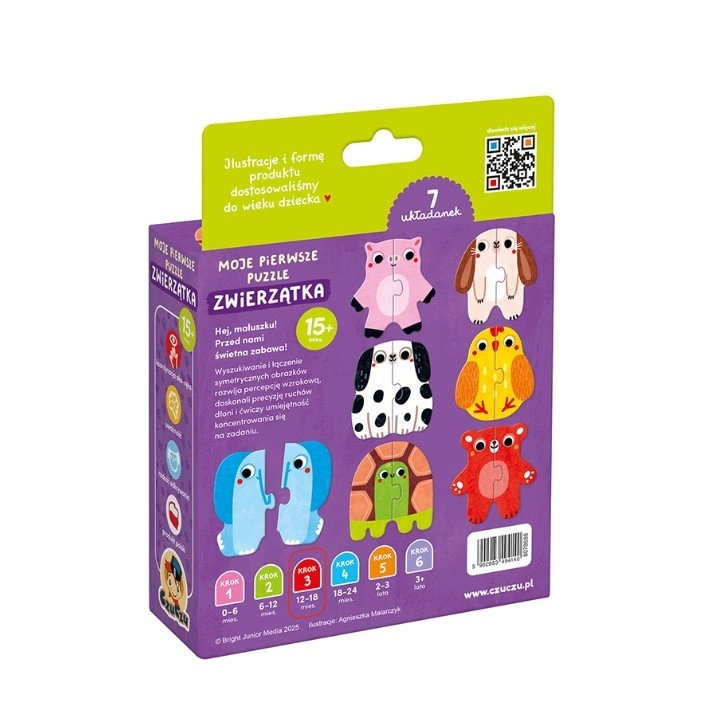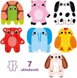 I miei primi puzzle – animaletti sono i puzzle ideali per i principianti. I bambini cercano e uniscono le due metà delle immagini, scoprendo il mondo degli animali in modo ludico. Ogni abbinamento corretto è un piccolo successo che li motiva a continuare a giocare.