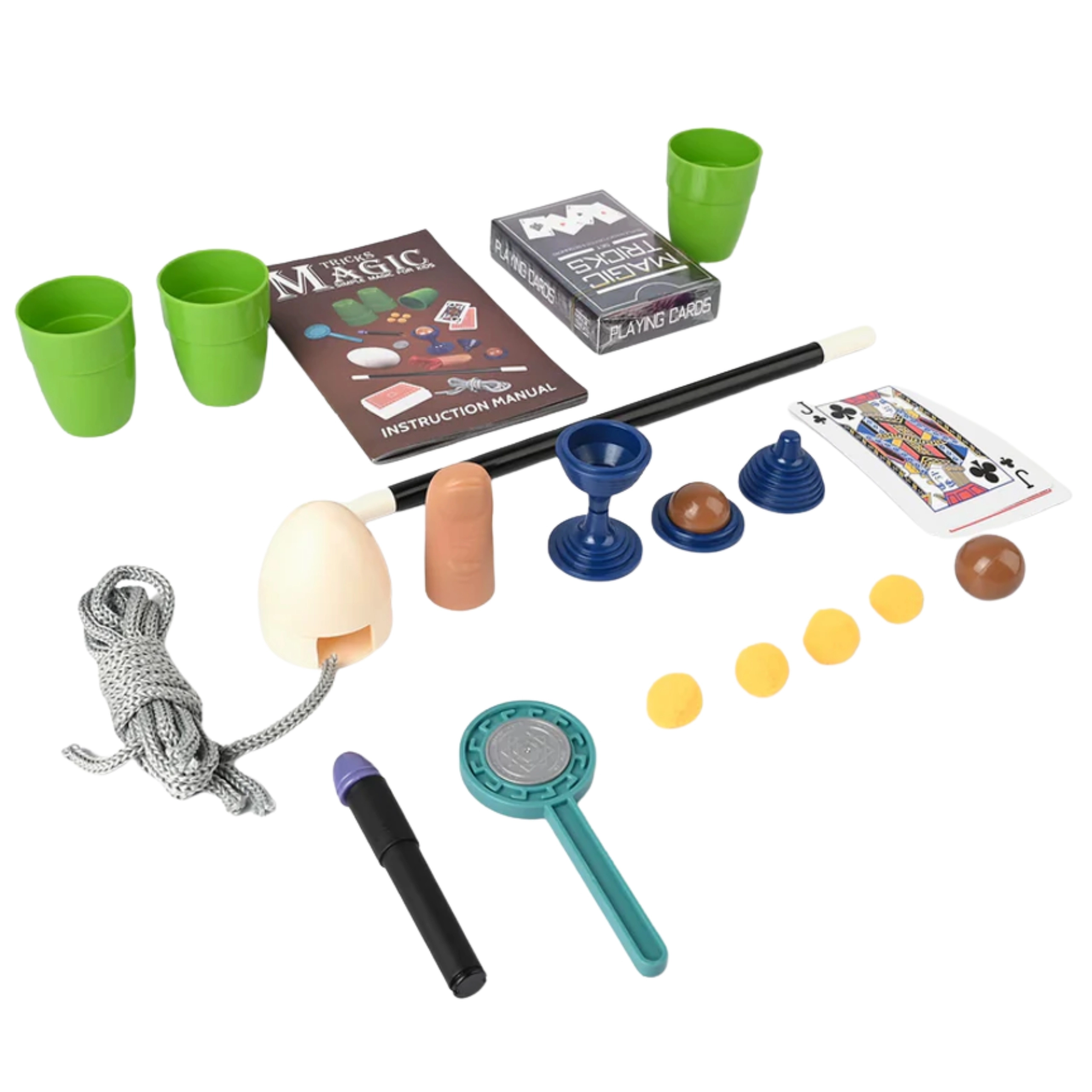 Scopri il mondo delle illusioni con il set WOOPIE per piccoli maghi. Grazie alle istruzioni chiare e all’accesso alle lezioni video, i bambini imparano rapidamente trucchi impressionanti con carte, corde e bacchetta magica. Il set è progettato per divertire e al tempo stesso sviluppare abilità utili a scuola e nella vita.