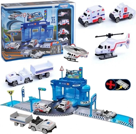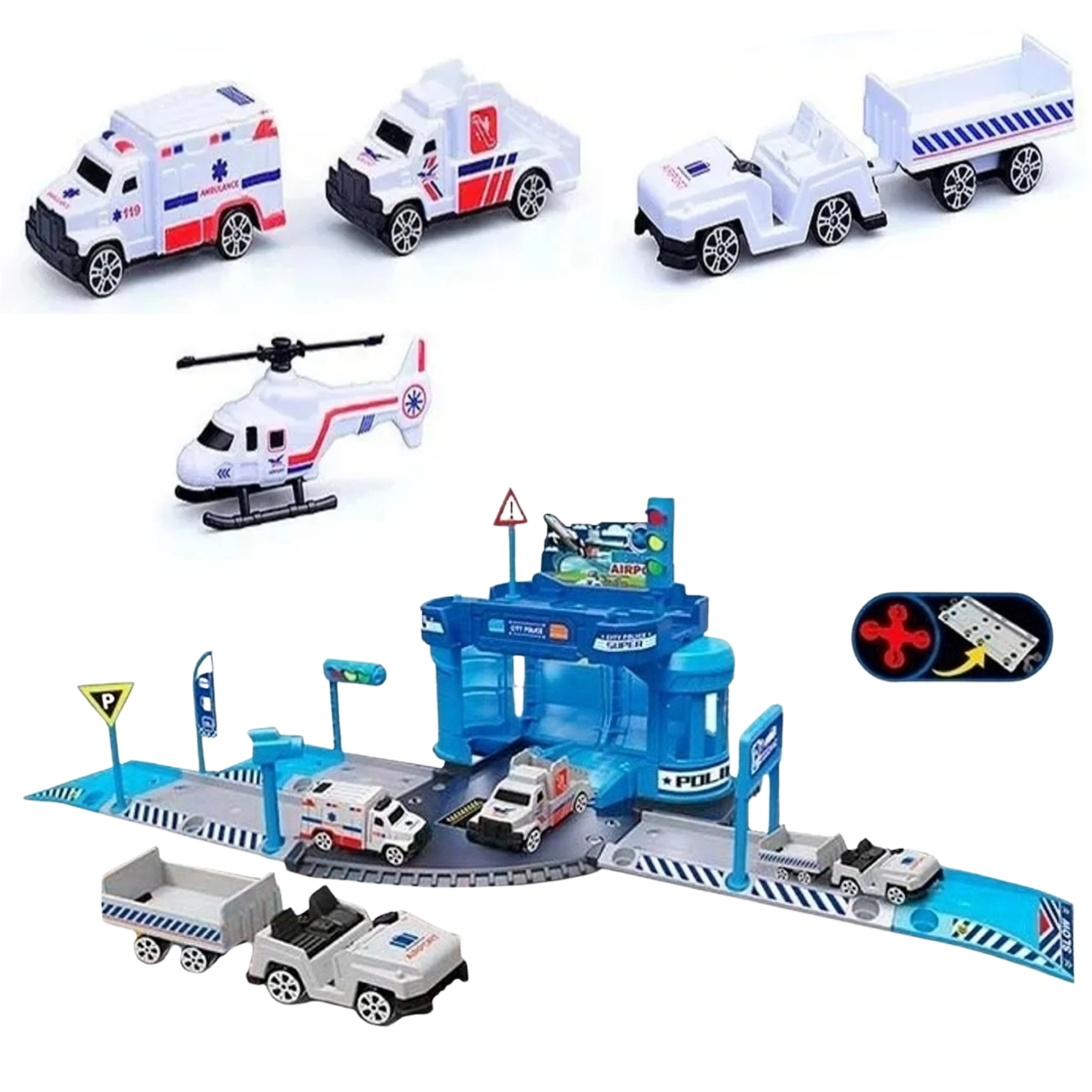 Il set include una costruzione componibile della stazione, un auto della polizia, un piccolo elicottero della polizia, il mezzo scale mobile dell’aeroporto, un veicolo con rimorchio per bagagli, segnali stradali, elementi della via di accesso e un tappetino in pellicola 78 × 58 cm. I bambini sviluppano la motricità fine, la coordinazione occhio–mano e la fantasia.