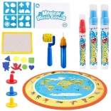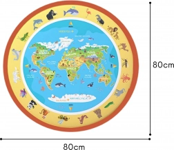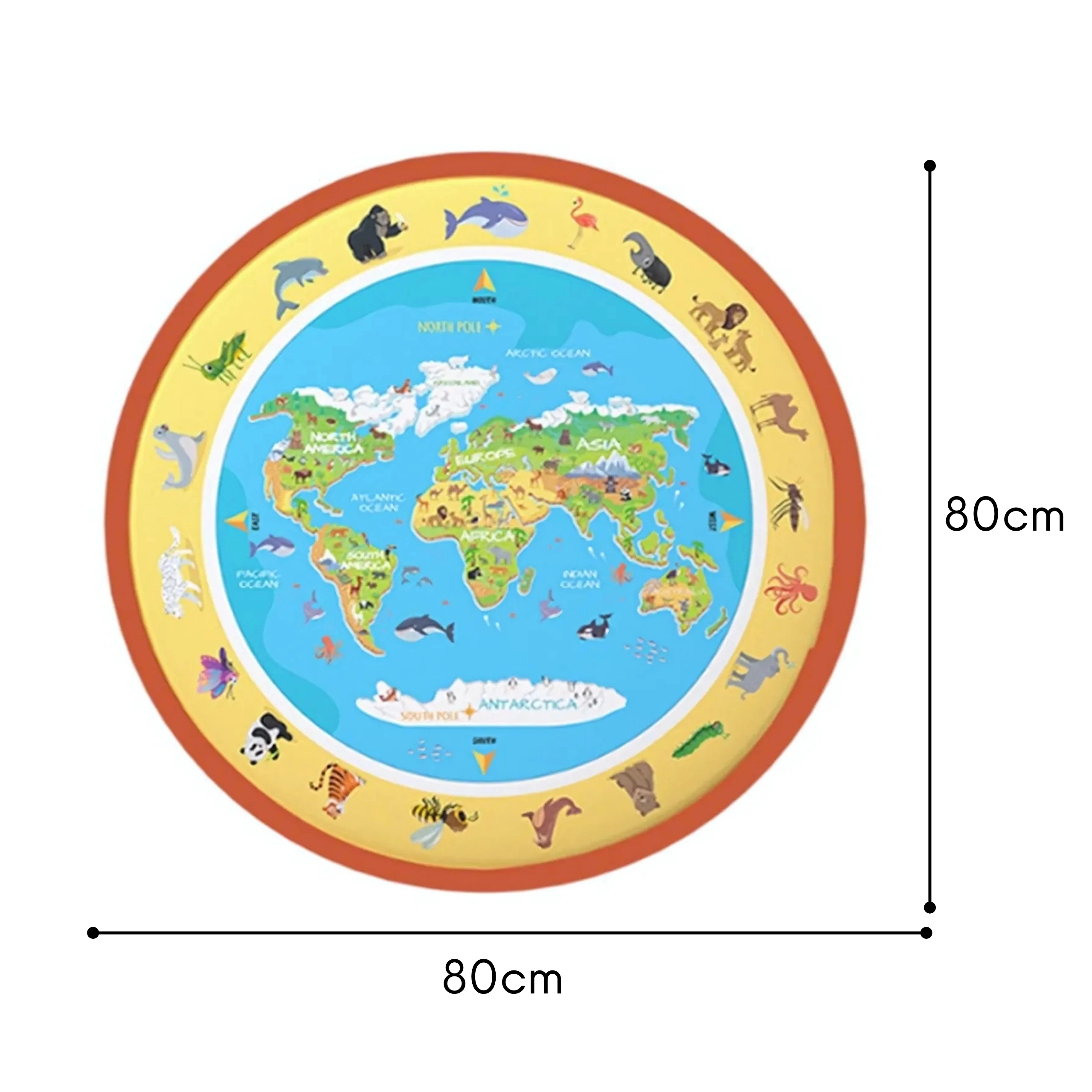 Grande tappetino rotondo ad acqua dal diametro di 80 cm con mappa del mondo e animali che trasforma il pavimento in un atelier creativo. I bambini disegnano solo con acqua – senza colori, macchie o preoccupazioni – e le immagini scompaiono da sole quando si asciugano. Stimola motricità fine, creatività e la conoscenza del mondo fin dalla tenera età.