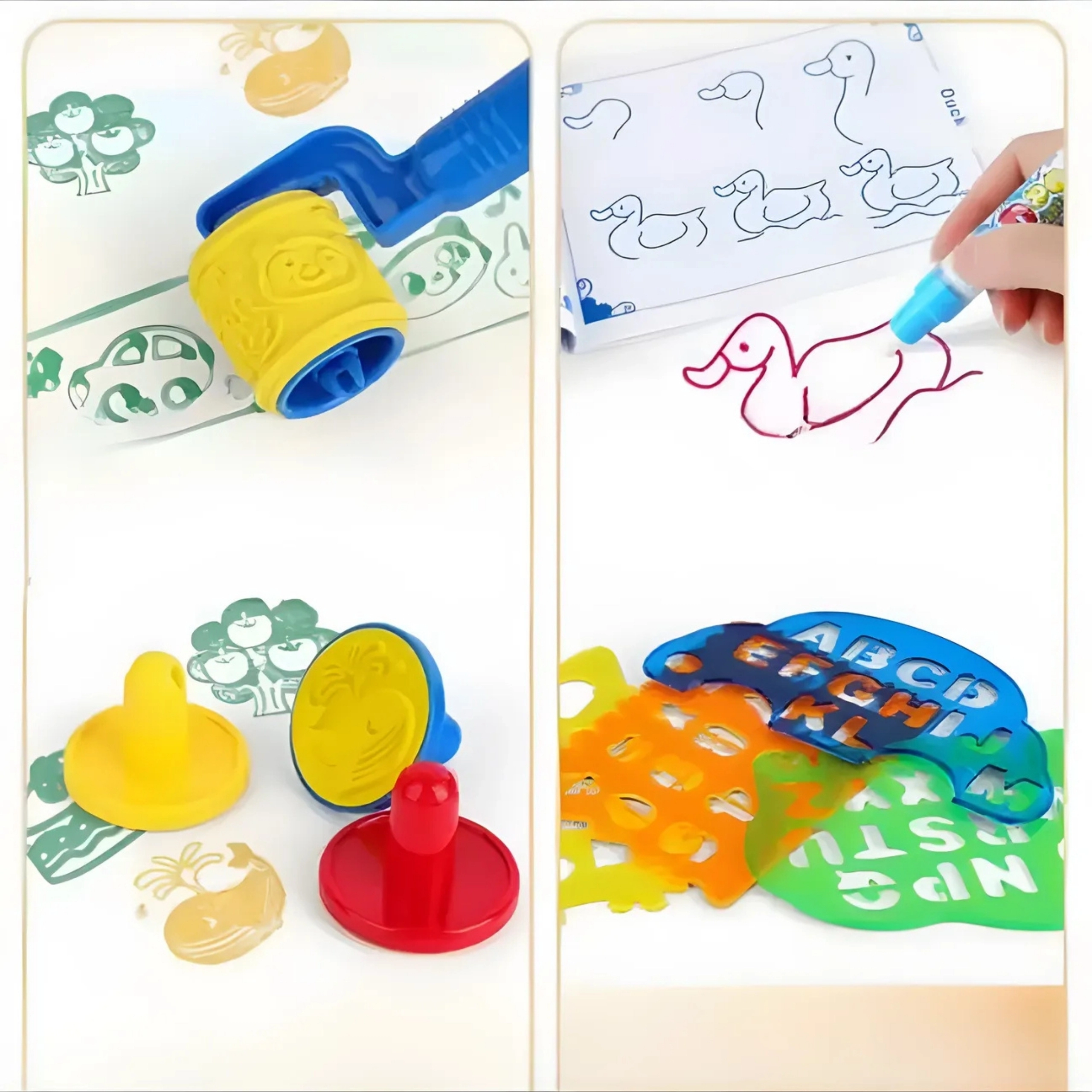La confezione include stencil, forme, timbri e un rullo decorativo per sviluppare fantasia, motricità fine e le prime abilità grafomotorie.