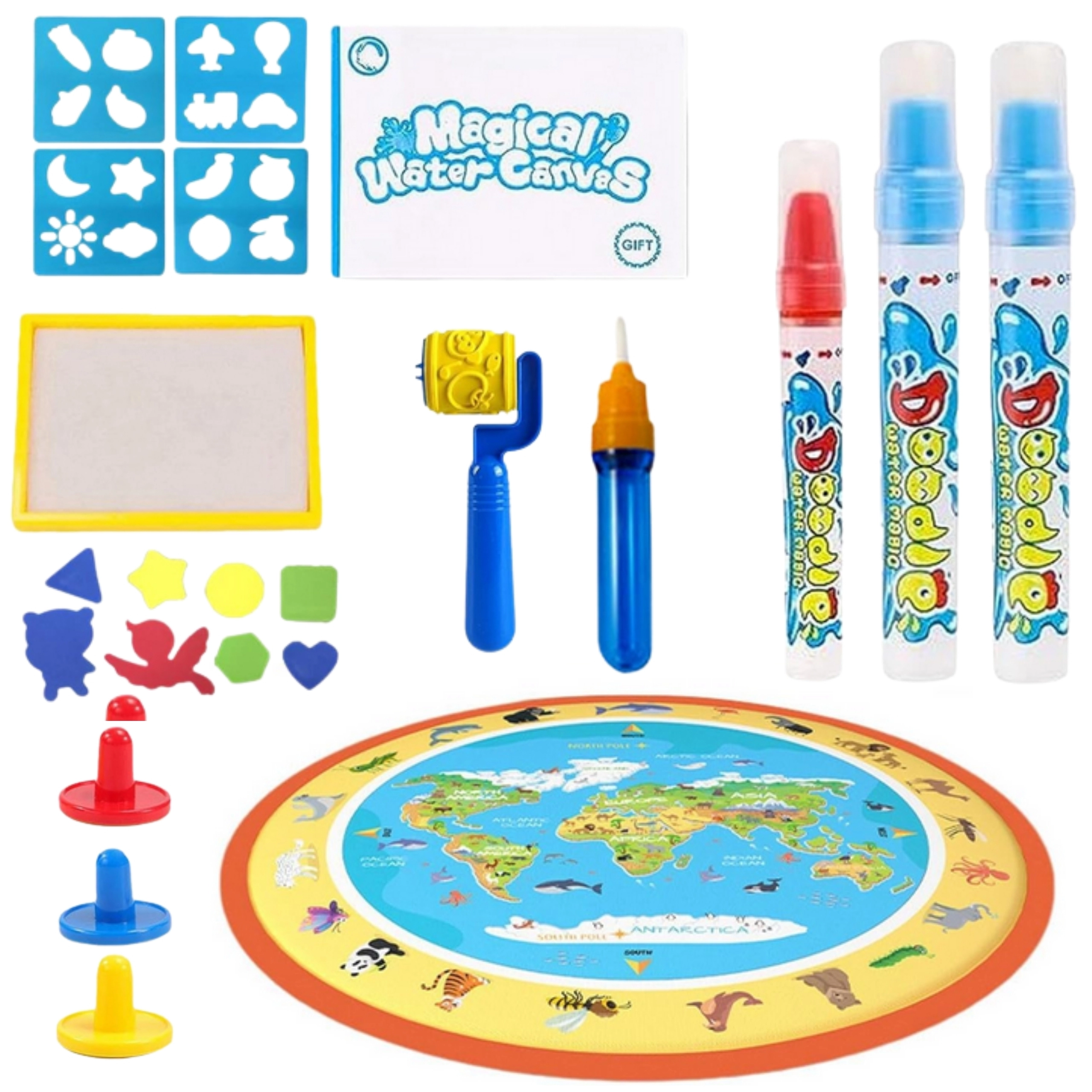 Il ricco kit incluso – 3 pennarelli ad acqua, un pennello, 4 stencil, 8 forme, 3 timbri e un rullo decorativo – garantisce ore di gioco e apprendimento. Il tappetino è ideale per il divertimento condiviso tra fratelli e amici ed è adatto dai 3 anni in su.