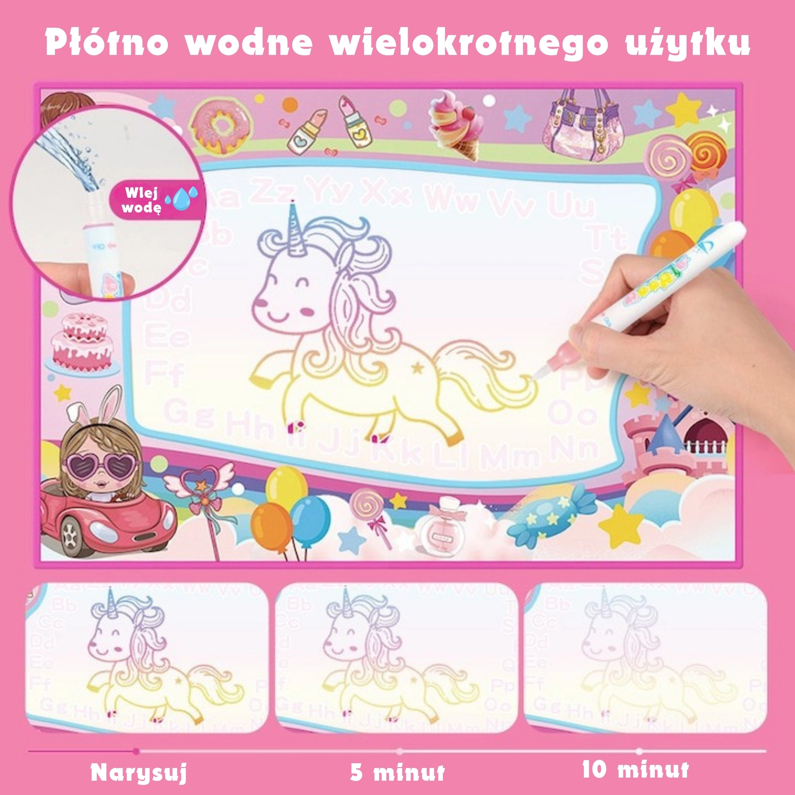 Scoprite la magia del creare senza disordine con il tappetino da disegno ad acqua 2in1 del marchio WOOPIE. I bambini possono disegnare sia con pennarelli ad acqua sia con la luce UV, mentre le immagini scompaiono da sole dopo pochi minuti, permettendo di creare di nuovo senza fine. Il grande formato offre tanto spazio per il gioco creativo; il motivo pieno di unicorni, palloncini e stelle stimola la fantasia e favorisce la motricità fine e la coordinazione occhio–mano.