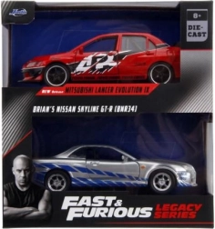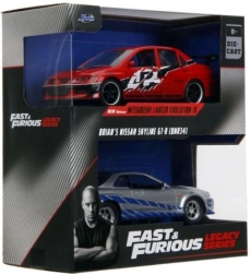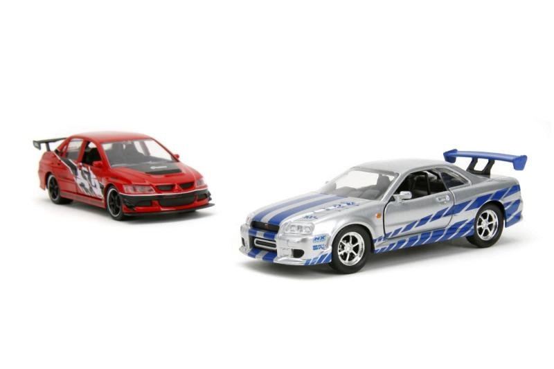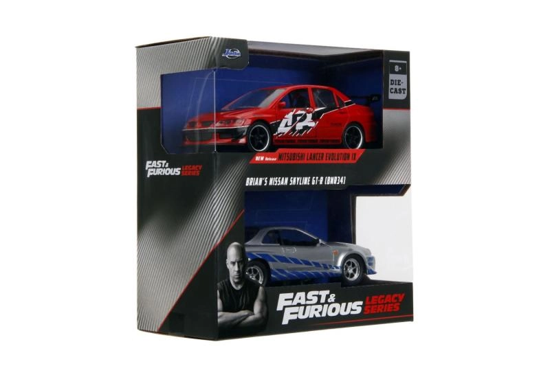 Ottieni in un colpo solo la Mitsubishi Lancer Evo IX 2006 e la Nissan Skyline GT‑R R34 di Brian – una coppia iconica di Fast & Furious in scala 1:32.