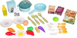 La pentola, la padella, gli utensili, i piattini e i cibi finti completano il forno e l’“ice box”. Ganci e ripiani aiutano a mantenere l’ordine durante il gioco.