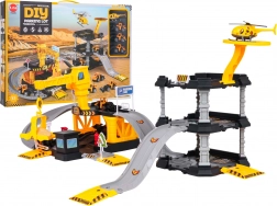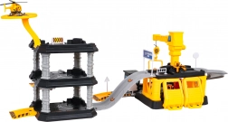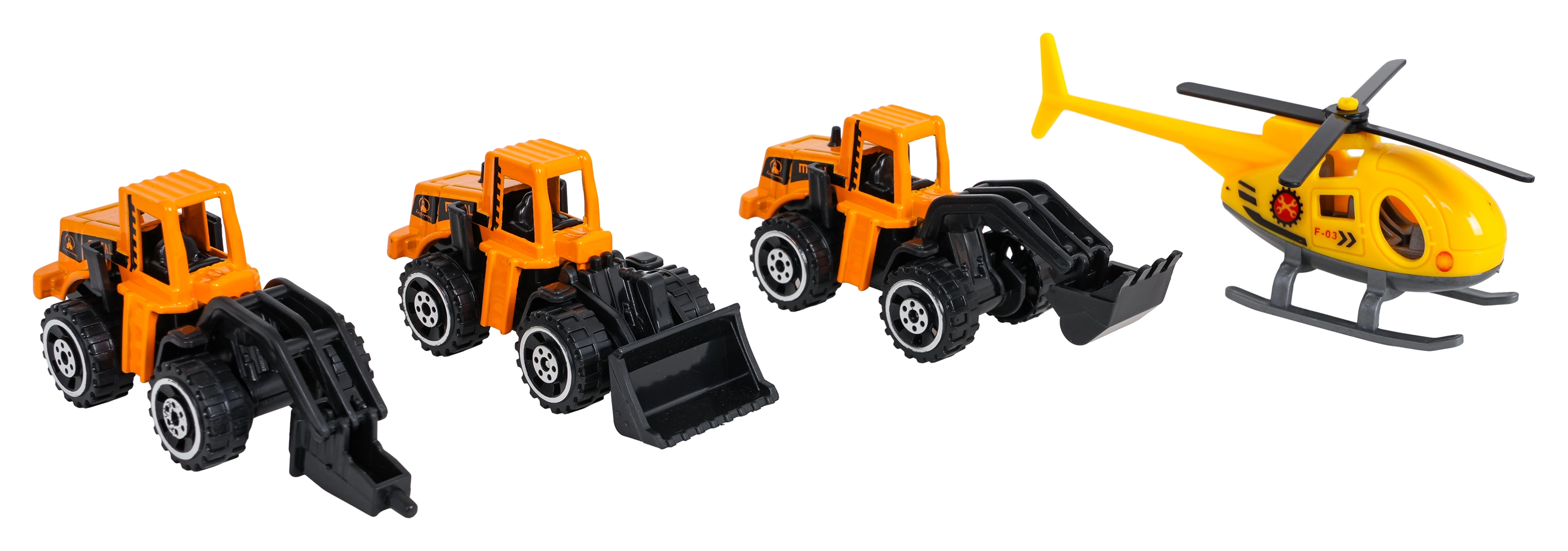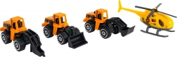 Inclusa una piazzola di atterraggio con elicottero e tre mezzi da cantiere: auto con martello, pala caricatrice ed escavatore – ciascuno con elementi mobili.
