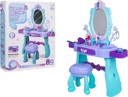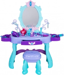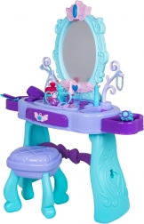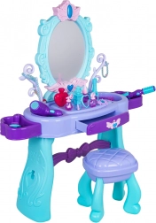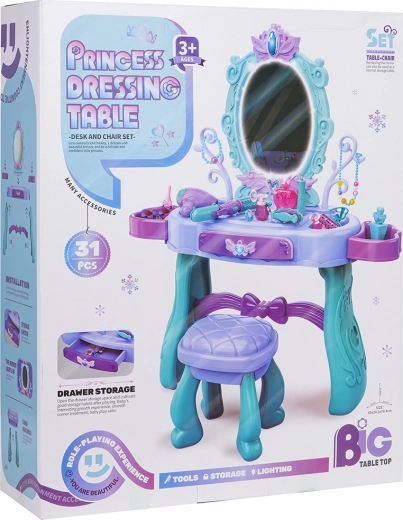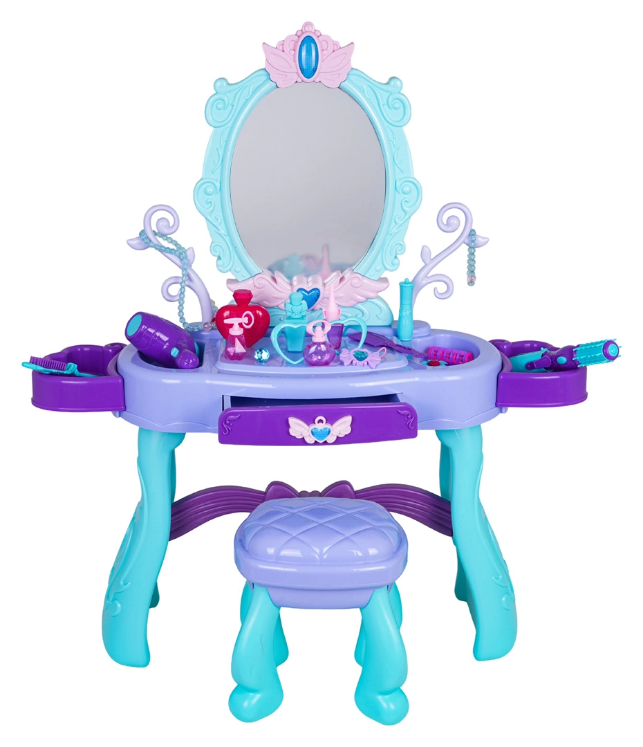 Elegante tavolino da toeletta per bambini con grande specchio, illuminazione e un ricco set di accessori per il gioco creativo. Include sgabello, cassetto e mensoline laterali per gli accessori. Nella confezione troverai phon, arricciacapelli con piastra, pettini, occhiali, gioielli e accessori make-up. Per la luce dello specchio sono sufficienti 2× batterie AA (non incluse). Ideale come regalo per piccole principesse dai 3 anni.