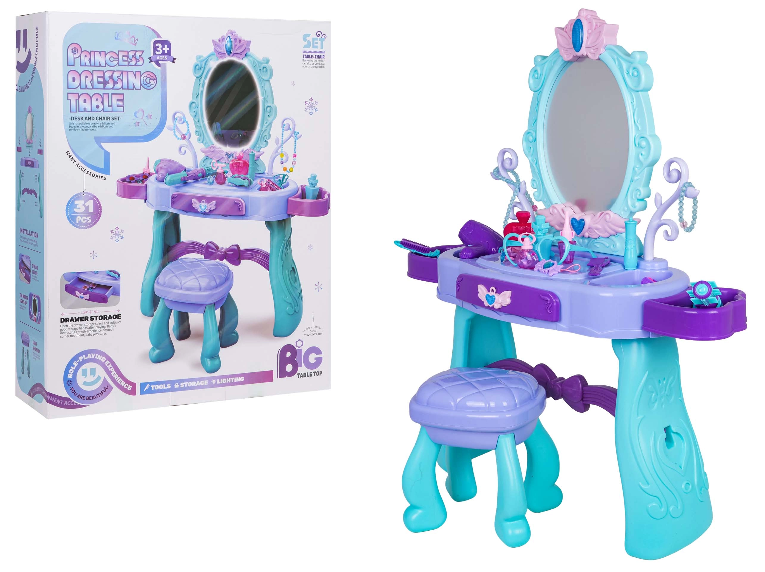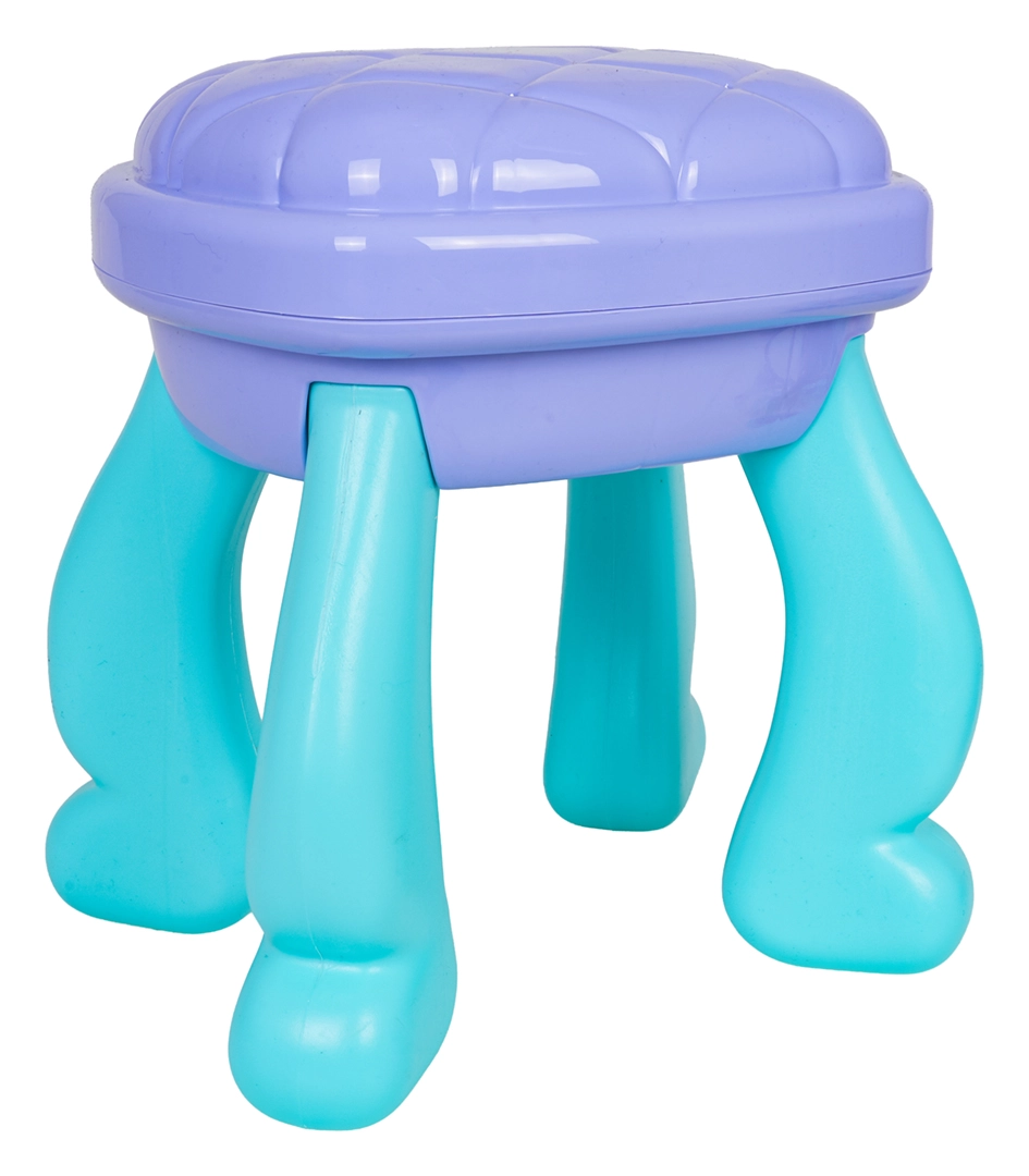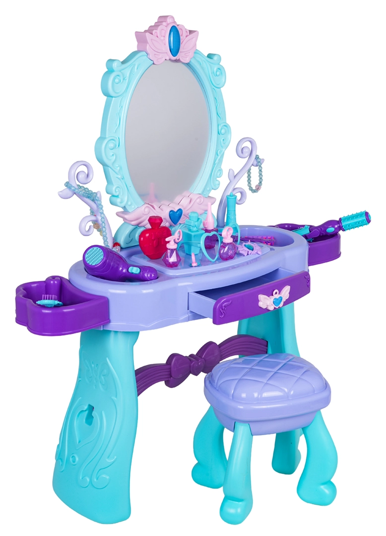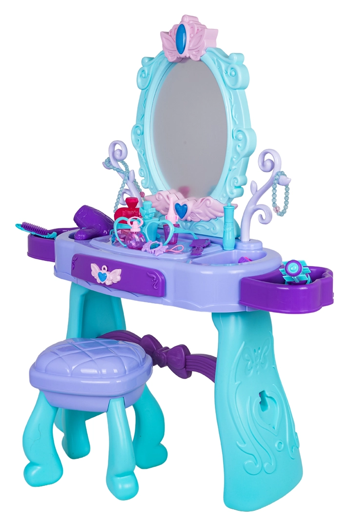 Regala ai bambini il loro angolo beauty incantato. Questo tavolino da toeletta nelle tonalità turchese e viola offre un grande specchio ovale con illuminazione, un pratico cassetto e piani d’appoggio laterali per tutti gli accessori. Lo sgabello stabile assicura una seduta comoda e un gioco in sicurezza.