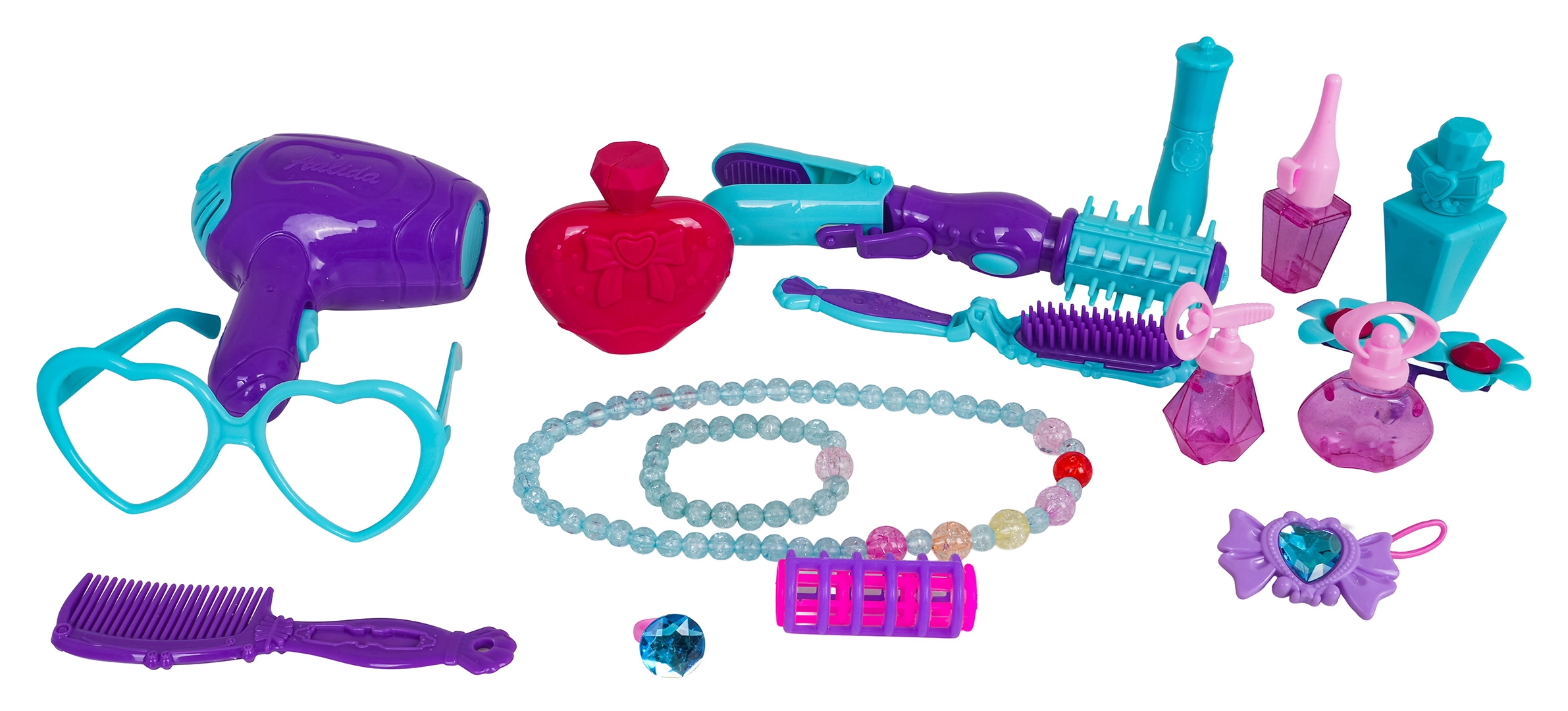 Include phon, arricciacapelli con piastra, spazzola pieghevole, pettine, occhiali, boccette, “rossetto” e “smalto”, collana di perle, braccialetto, anellino, mollette, elastico e altre piccole chicche.