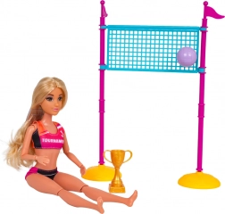 Rete per beach volley, pallone, trofeo e tre outfit sportivi. Accessori come casco, scarpe, occhiali e borraccia rendono i giochi autentici e sicuri.