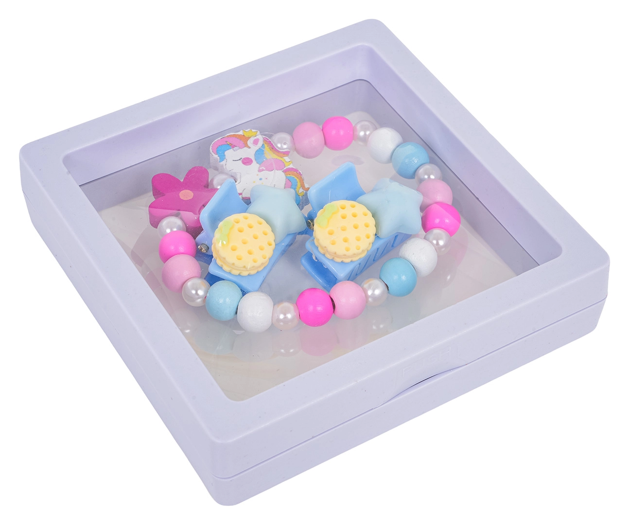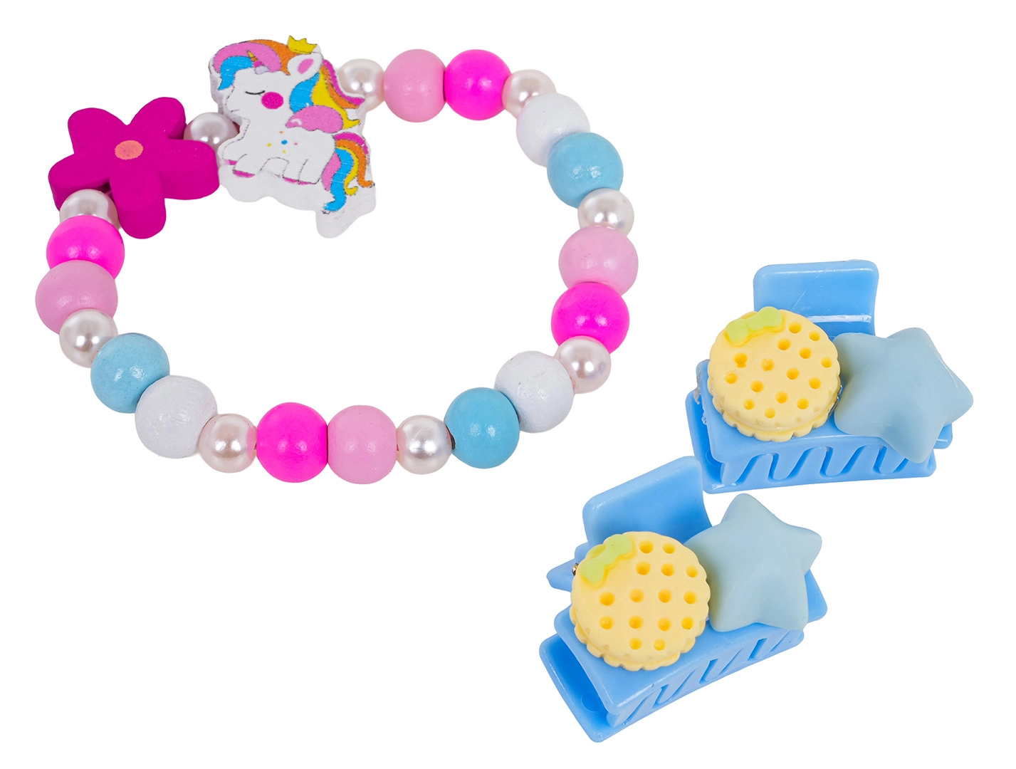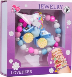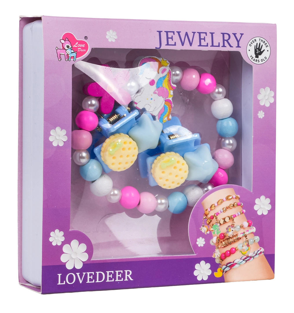 Scopri il set di gioielli giocoso con unicorno, che combina perline colorate, perline effetto perla e accessori per capelli coordinati. Il braccialetto elastico si infila con facilità, le mollette tengono saldi i ciuffi delicati, e l’intero set è perfetto per l’uso quotidiano come anche per i momenti di festa.