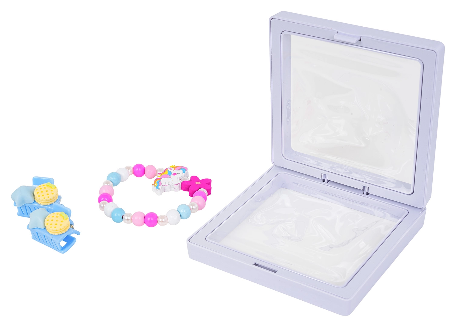 Grazie alle dimensioni compatte, il set entra comodamente nello zainetto o nel cassetto, ed è pronto per giocare a casa e in viaggio. Scelta perfetta per le piccole amanti dei colori e dei motivi carini, che vogliono abbinare braccialetto e capelli in un unico stile.